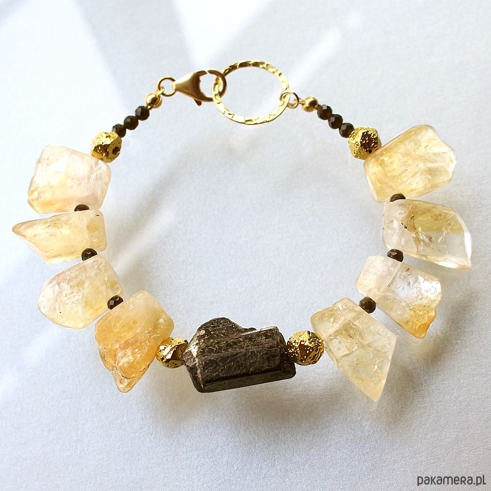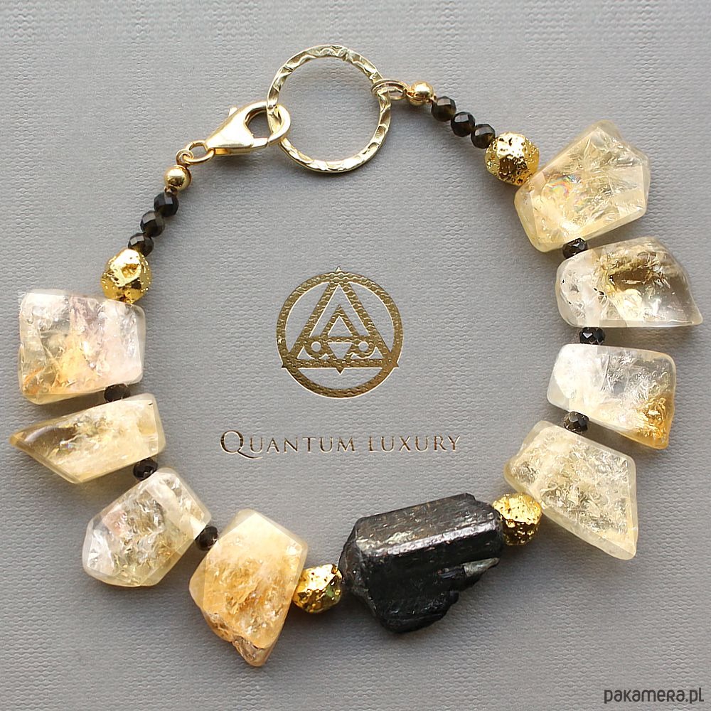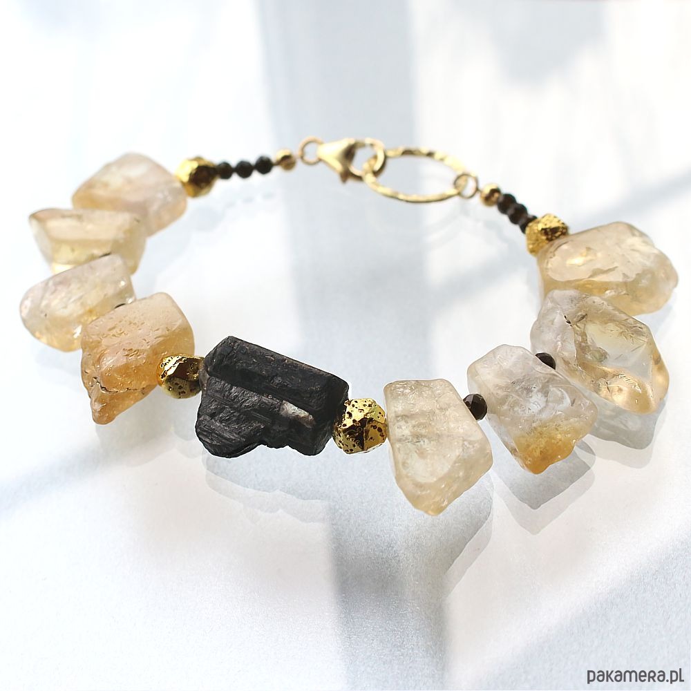 Energetyczna, masywna bransoleta mocy wykonana ręcznie, z naturalnym surowym turmalinem, cytrynem z pięknymi tęczowymi inkluzjami, fasetowanym złotym obsydianem i lawą wulkaniczną pozłacaną 24k złotem. Efektowna kompozycja z ozdobami wykonanymi ze srebra próby 925 pozłacanego 24k złotem.