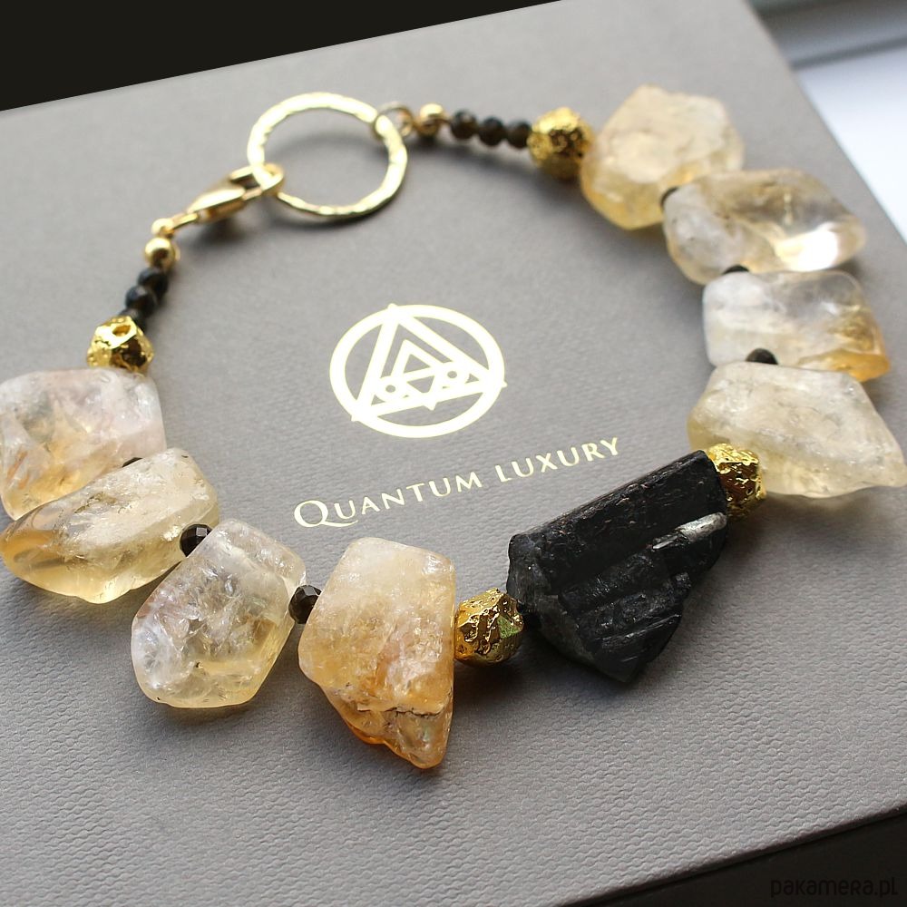 Energetyczna, masywna bransoleta mocy wykonana ręcznie, z naturalnym surowym turmalinem, cytrynem z pięknymi tęczowymi inkluzjami, fasetowanym złotym obsydianem i lawą wulkaniczną pozłacaną 24k złotem. Efektowna kompozycja z ozdobami wykonanymi ze srebra próby 925 pozłacanego 24k złotem.