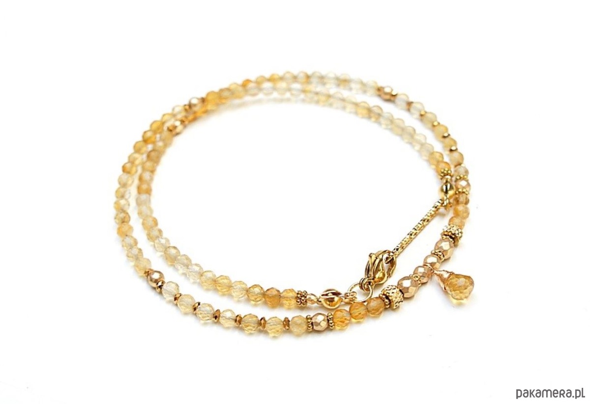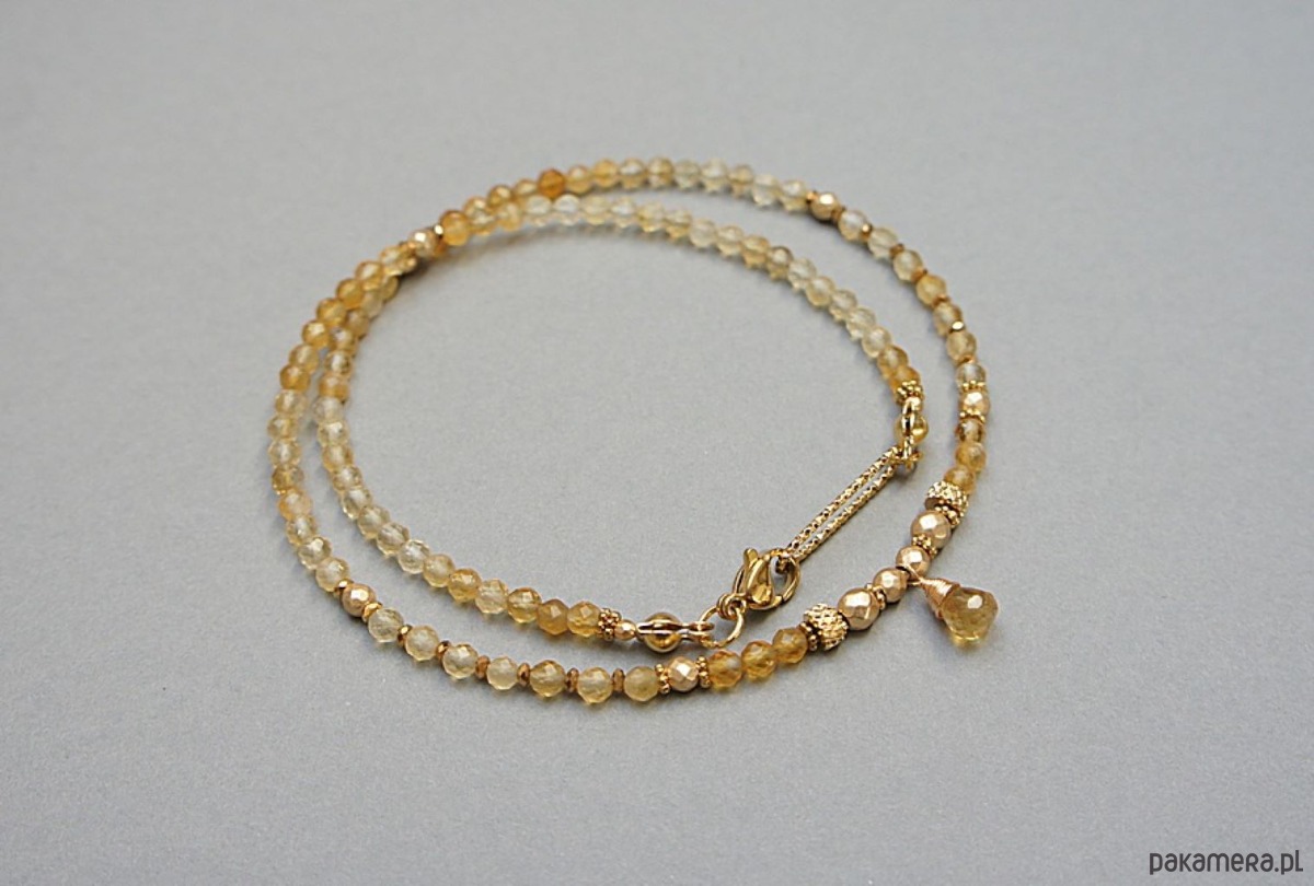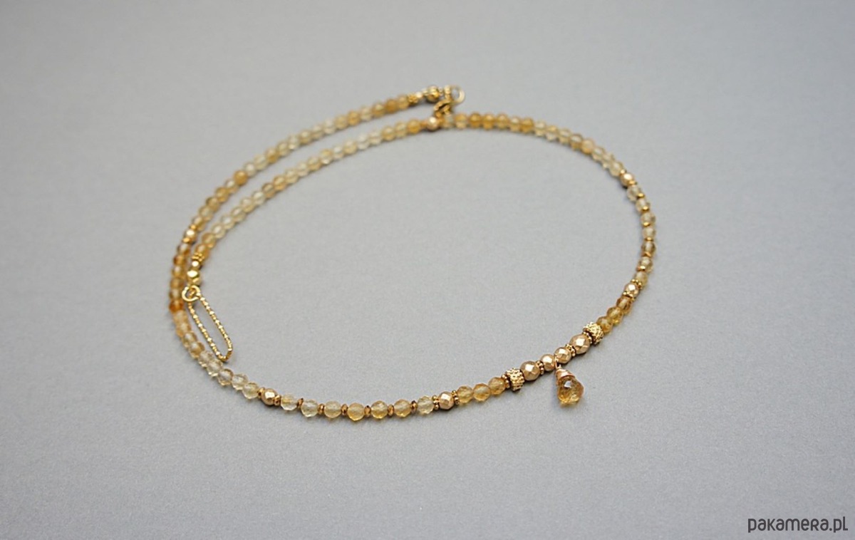 Krótki naszyjnik wykonany w całości z pozłacanej stali szlachetnej oraz naturalnych, szlachetnych kamieni - cytryn fasetowany [3mm], hematyt fasetowany, platerowany [3mm i 4mm], przekładek z hematytu [1mm] oraz fasetowanej brioletki cytrynu. Naszyjnik o długości ok. 42,5cm.