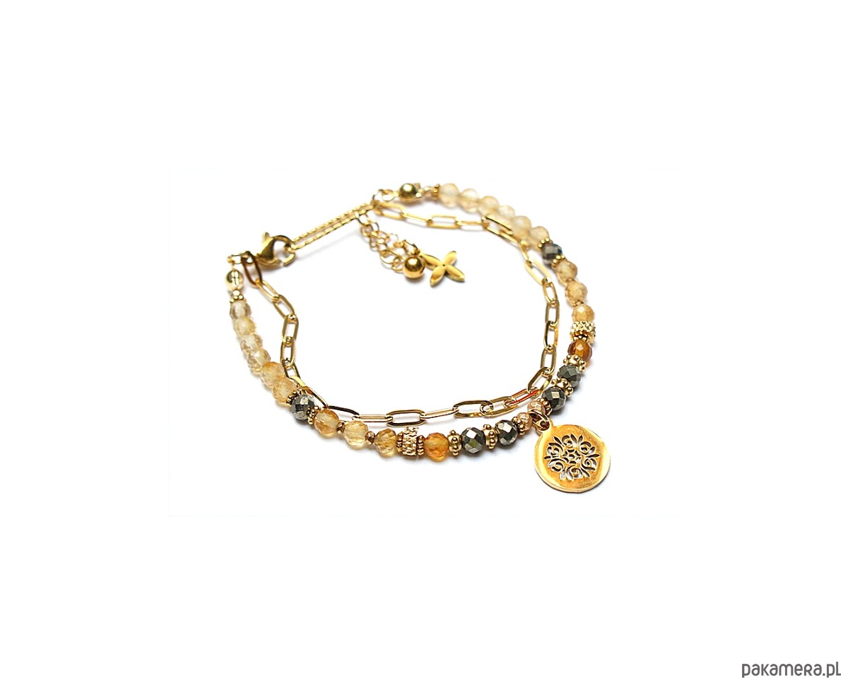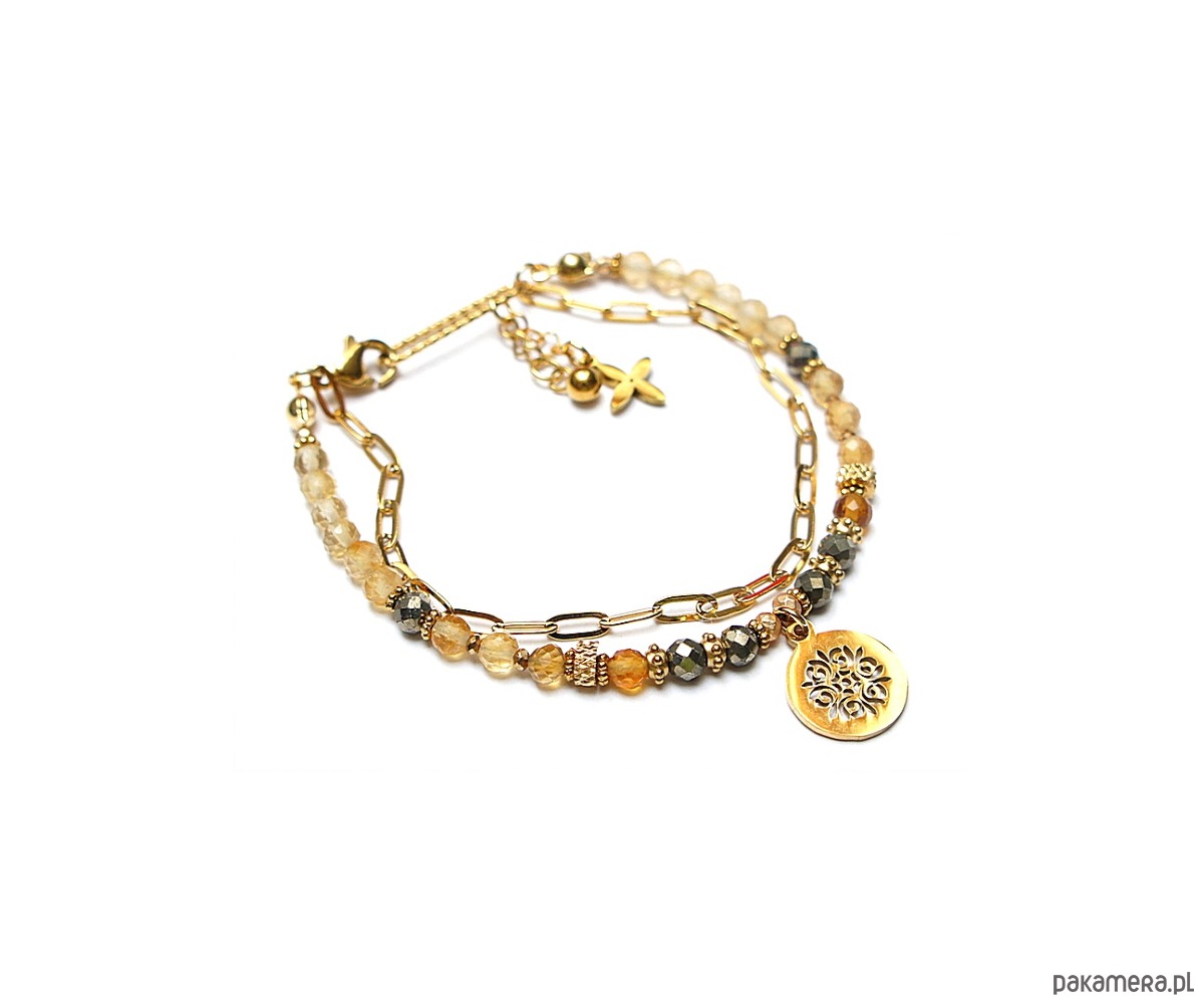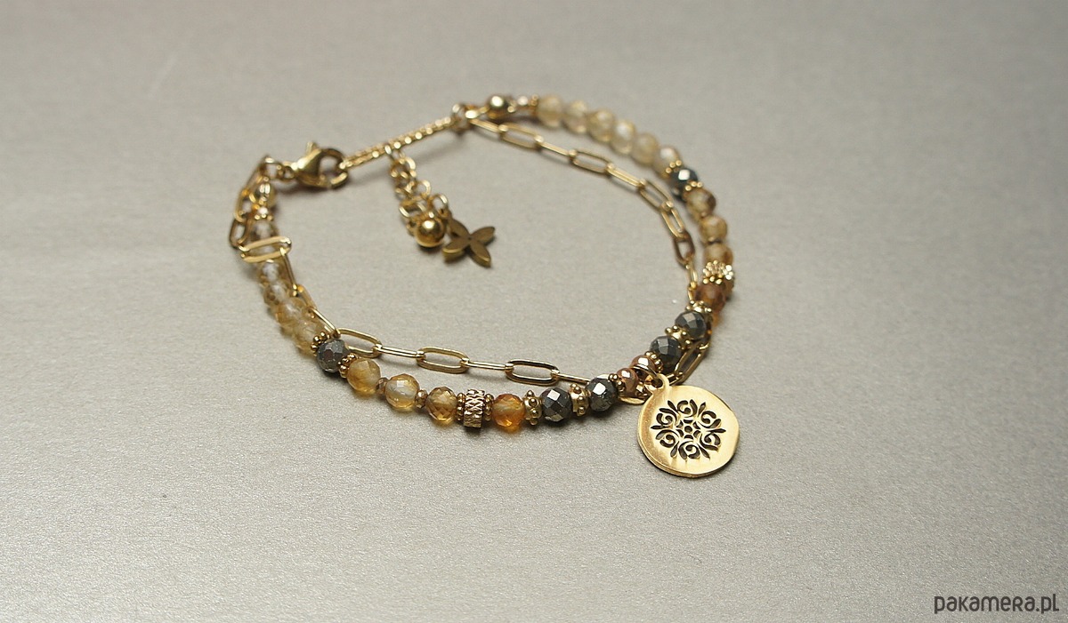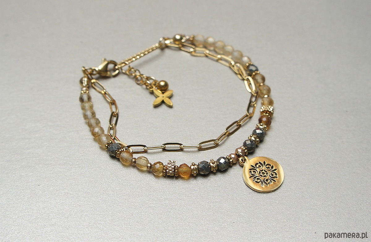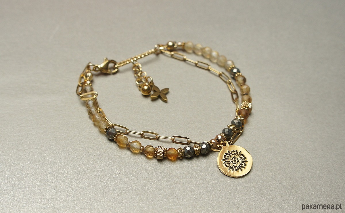 Delikatna bransoletka wykonana w całości ze stali szlachetnej pozłacanej, szlachetnych kamieni - cytryn fasetowany [4mm], piryt fasetowany [4mm], hematyt fasetowany, platerowany [3 x 2mm oraz 2mm],przekładek z hematytu [1mm]. Całkowita długość bransoletki ok. 18cm. Biżuteria ozdobnie zapakowana.