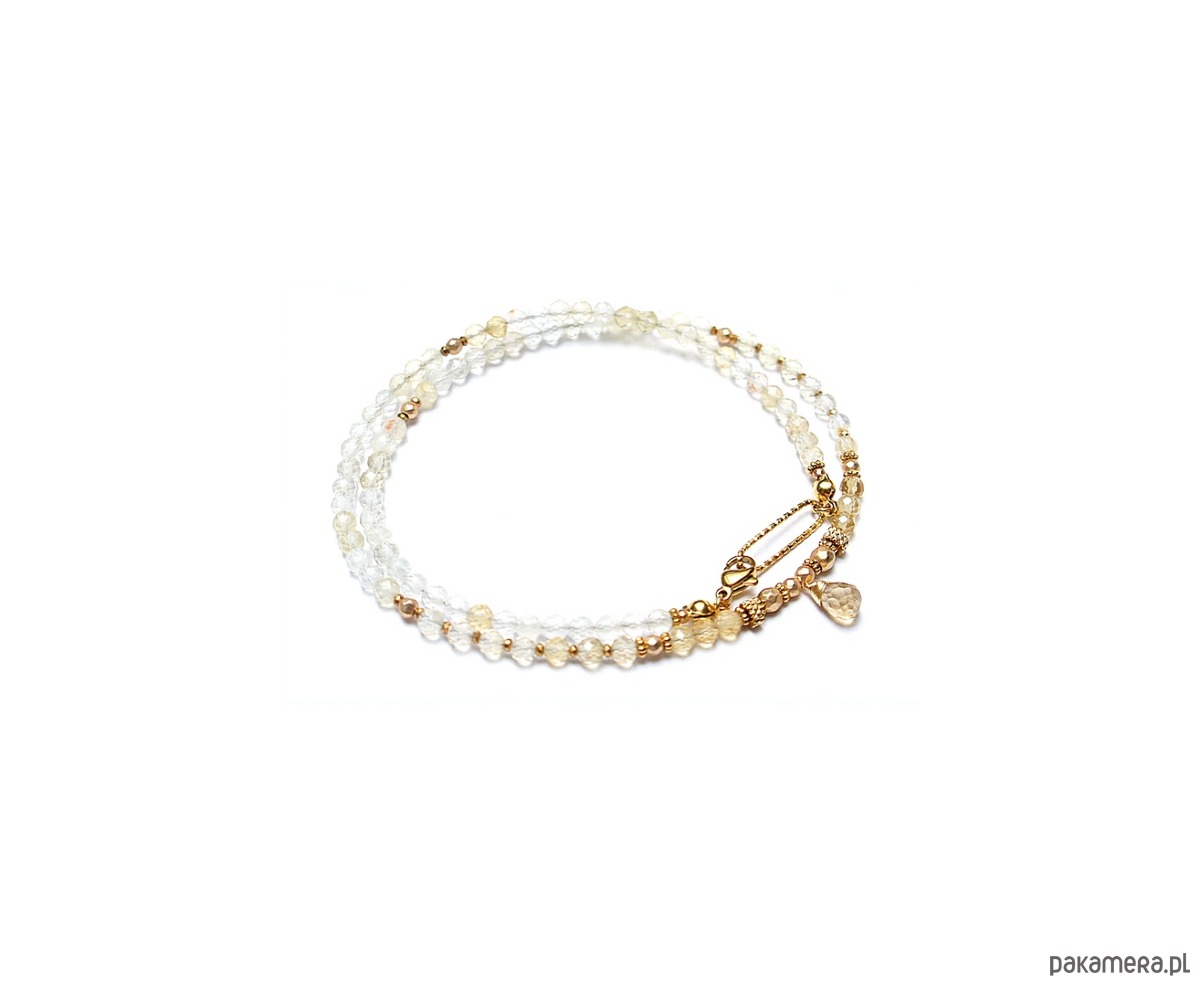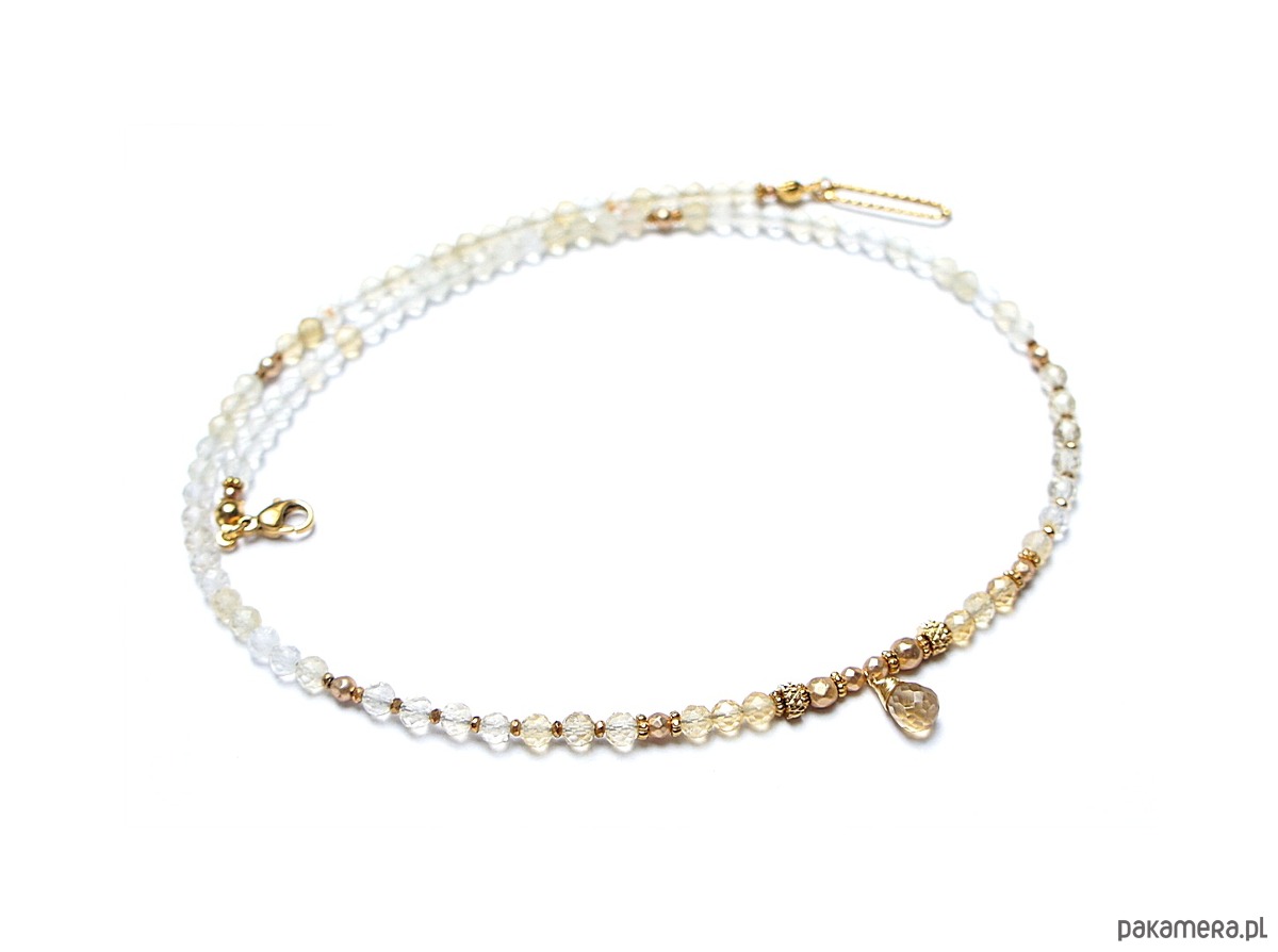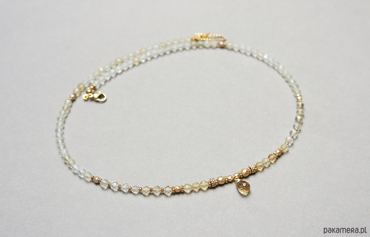 Krótki naszyjnik wykonany w całości z pozłacanej stali szlachetnej oraz naturalnych, szlachetnych kamieni - cytryn fasetowany [4mm], hematyt fasetowany, platerowany [4mm, 3mm i 2mm], przekładek z hematytu [1mm] oraz fasetowanej brioletki cytrynu. Naszyjnik o długości ok. 47,5cm.