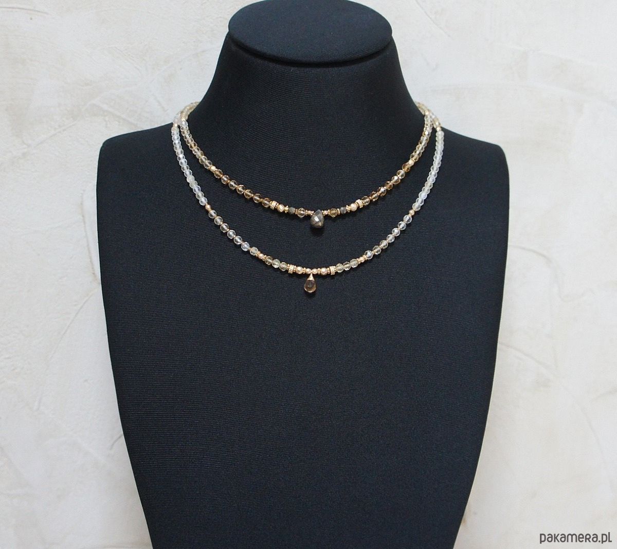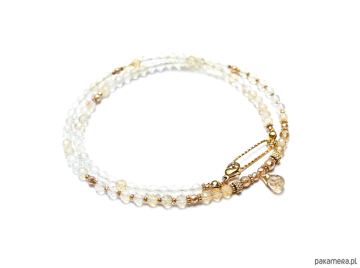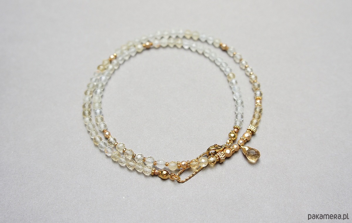 Krótki naszyjnik wykonany w całości z pozłacanej stali szlachetnej oraz naturalnych, szlachetnych kamieni - cytryn fasetowany [4mm], hematyt fasetowany, platerowany [4mm, 3mm i 2mm], przekładek z hematytu [1mm] oraz fasetowanej brioletki cytrynu. Naszyjnik o długości ok. 47,5cm.