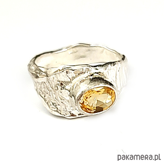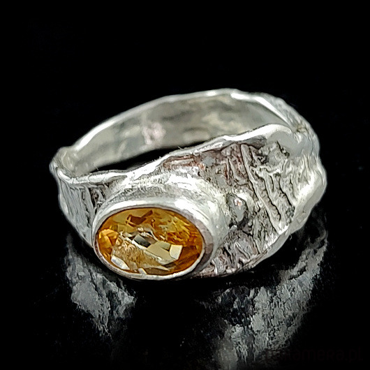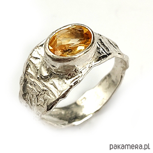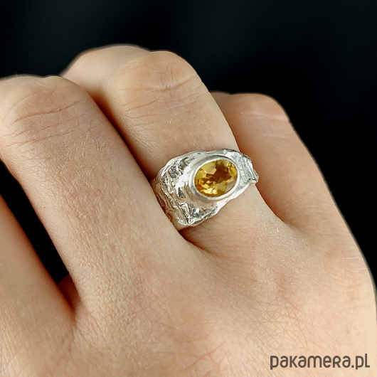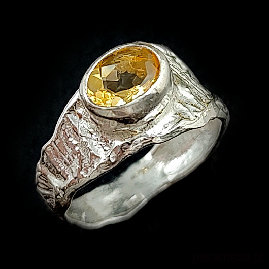 Piękny, fasetowany cytrynoprawiony własnoręcznie w srebro próby 925. Kamień mieni się odcieniami zlota. Obrączka asymetryczna o szerokości 4-11 mm. Oprawa kamienia o pięknym szlifie 9 x 7 mm, rozmiar jubilerski 17, mogę powiększyć na max.18. Waga 4,5g.