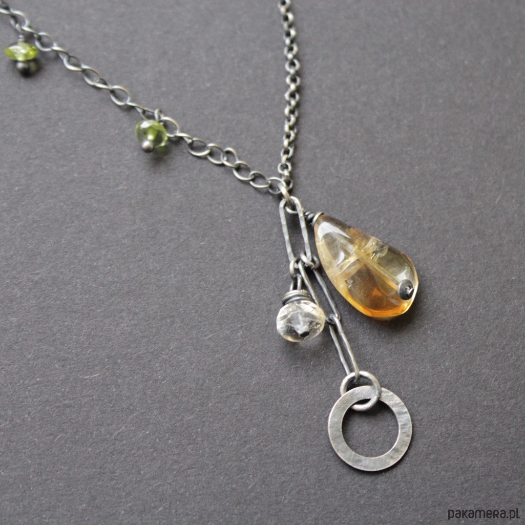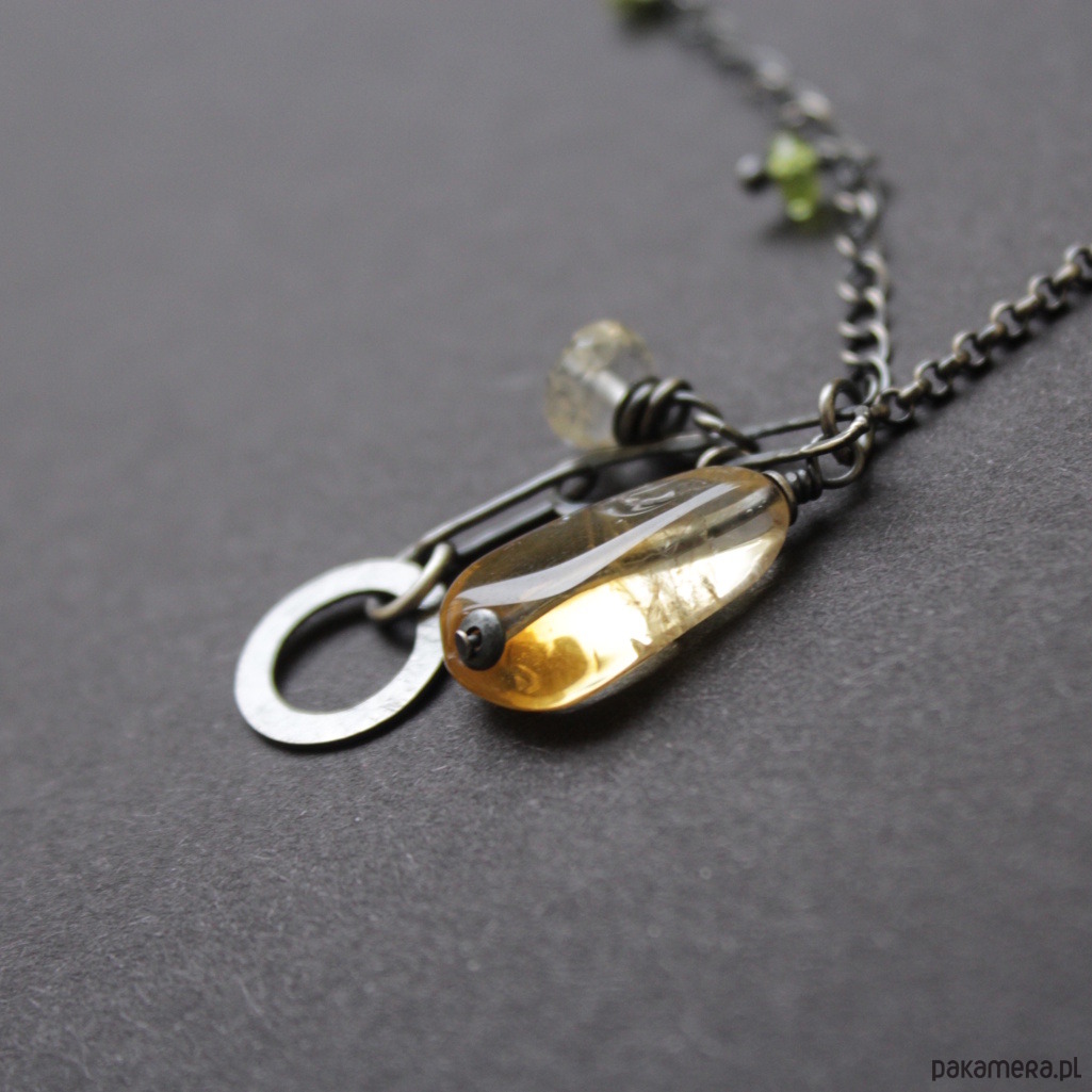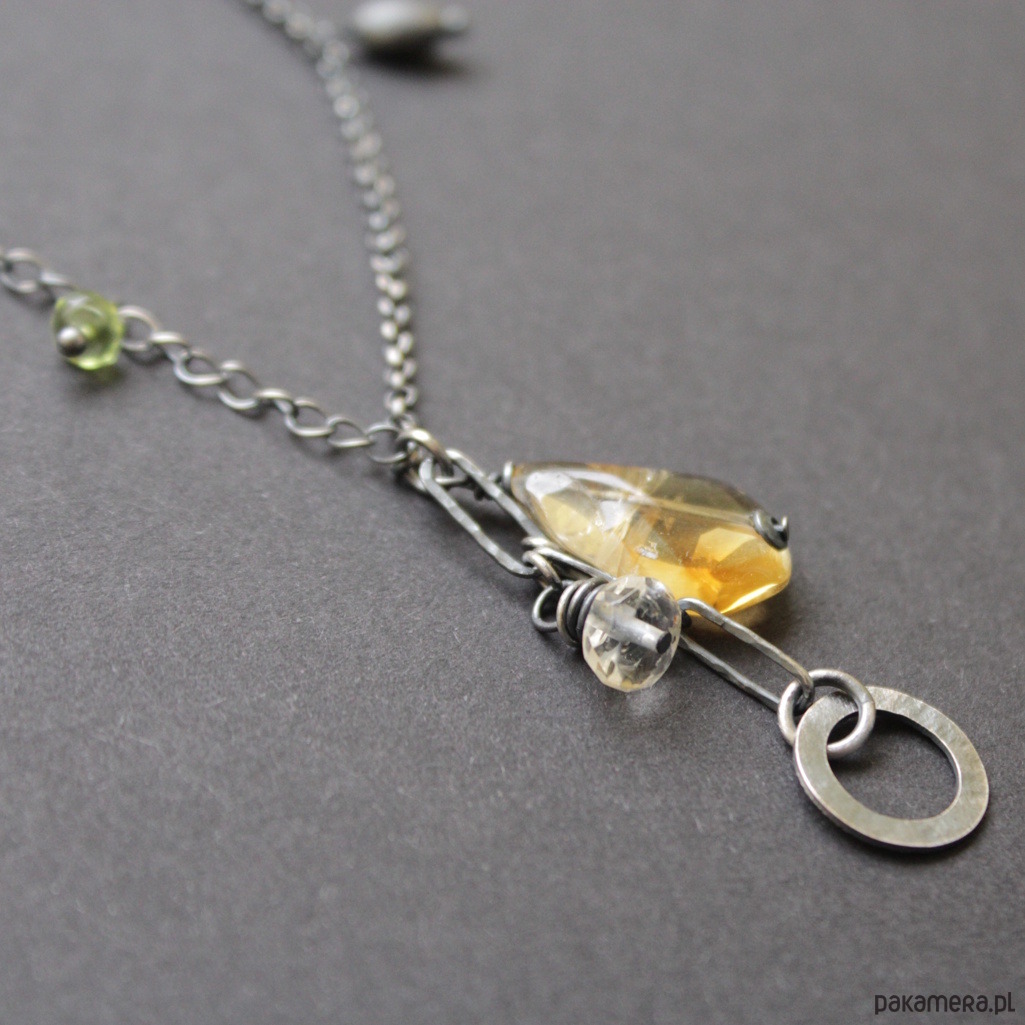 Naszyjnik zdobi piękny cytryn wielkości 1,8 cm oraz mniejszy fasetowany cytryn wielkości 0,6 cm.