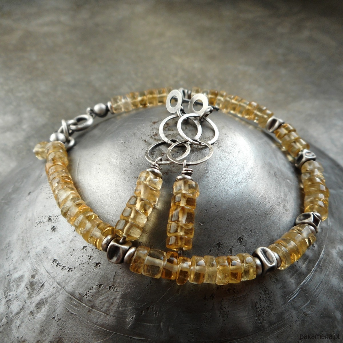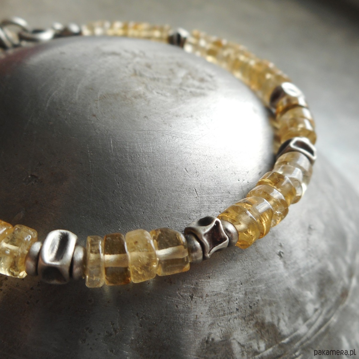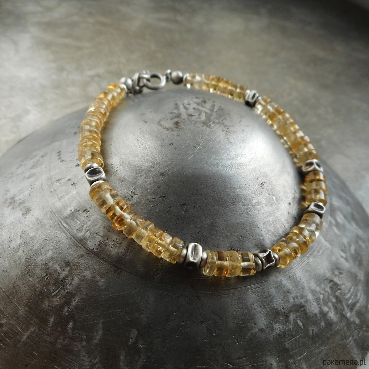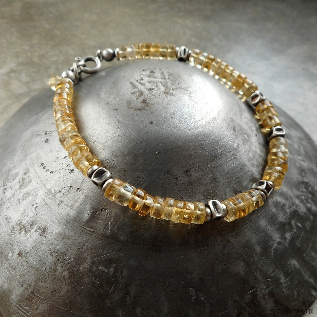 Wyjątkowa bransoletka z kamieni naturalnych i szlachetnego srebra; klasyczna i elegancka, z pięknymi, przejrzystymi cytrynami i srebrnymi gniecionymi przekładkami. Do kompletu polecam kolczyki dostępne w mojej galerii.