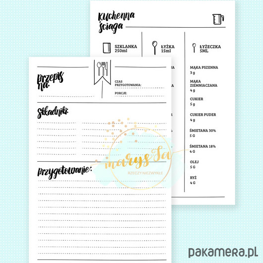 Przepiśnik w formacie A5, w środku kieszonka, ściąga z miar na końcu oraz ok 100 kartek z nadrukiem.