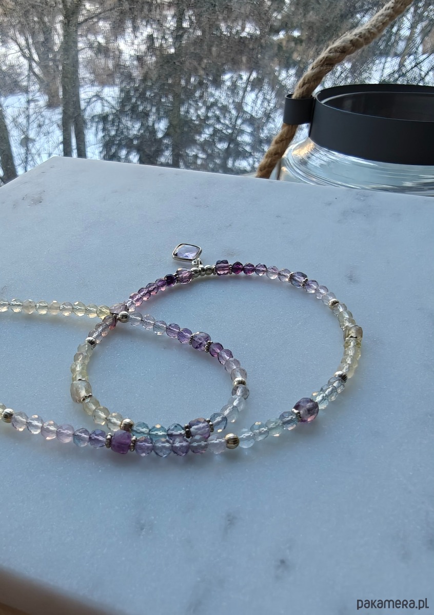 Delikatny naszyjnik z fluorytami w kilku odcieniach. Kamienie mają kształt kosteczek, ładnie chwytają światło i rozpraszają wokół. Naszyjnik jest świetlisty i bardzo pozytywny. Ozdobiony zawieszką z komponującym się kolorystycznie, jasnym ametystem. Dominuje fiolet, kolor czakry korony. Ze srebrnymi dodatkami. Idealny na prezent.