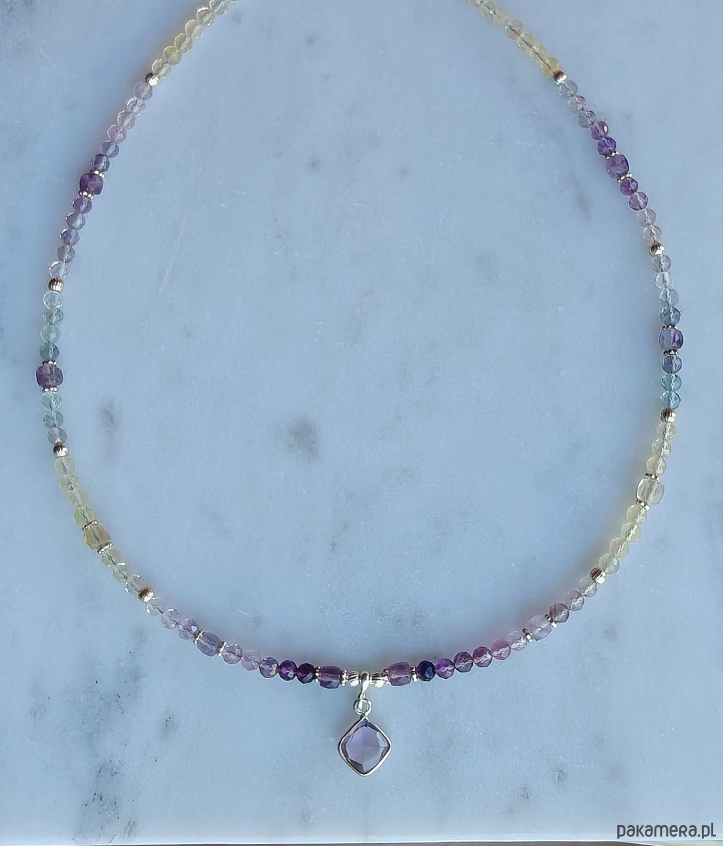 Delikatny naszyjnik z fluorytami w kilku odcieniach. Kamienie mają kształt kosteczek, ładnie chwytają światło i rozpraszają wokół. Naszyjnik jest świetlisty i bardzo pozytywny. Ozdobiony zawieszką z komponującym się kolorystycznie, jasnym ametystem. Dominuje fiolet, kolor czakry korony. Ze srebrnymi dodatkami. Idealny na prezent.