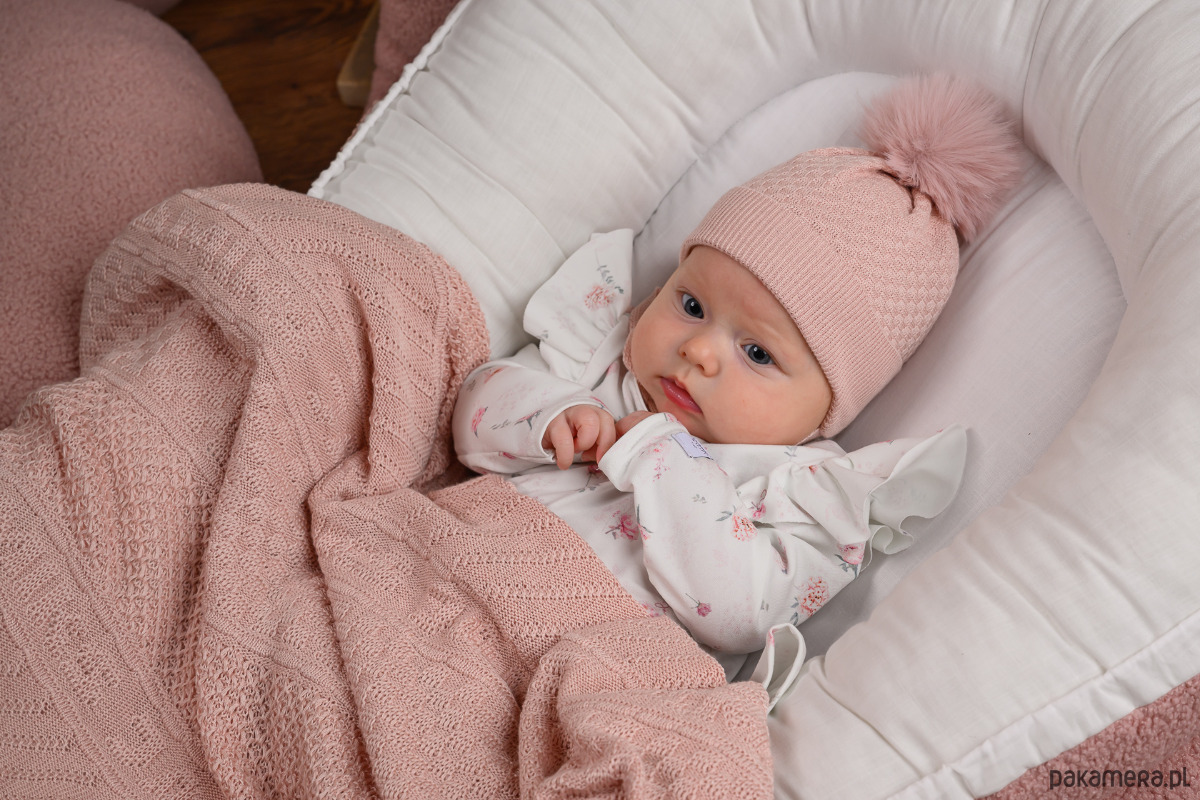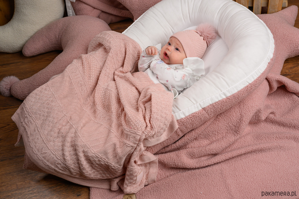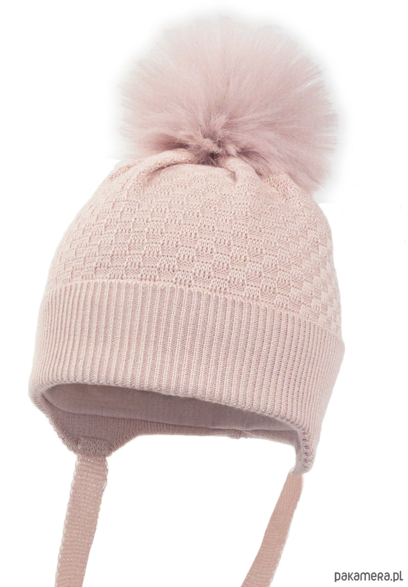 Czapka bambusowa niemowlęca na zimę LOLO z pomponem pudrowy róż