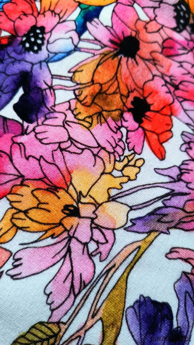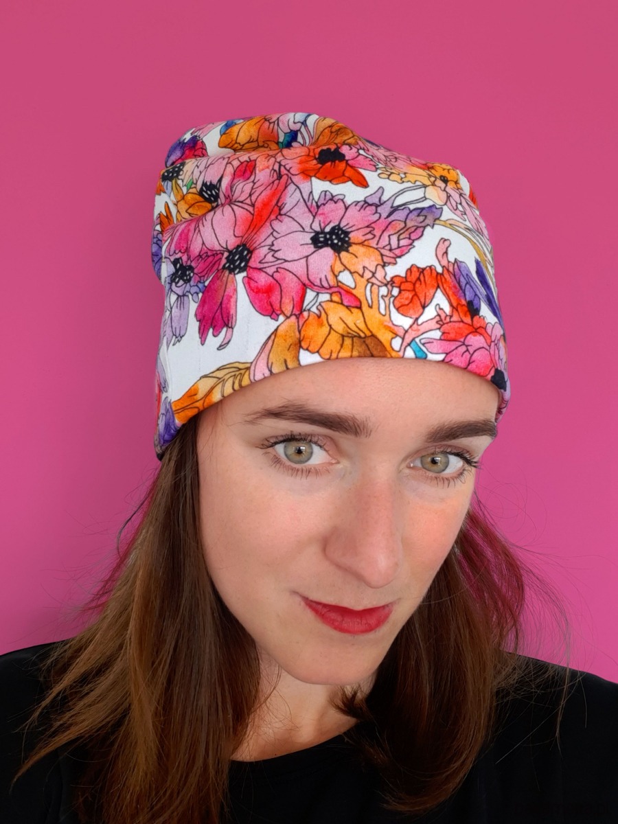 Każda sztuka ma mój własny nadruk, przeniesiony prosto z akwareli, które maluję (więc trochę jakbyś nosiła kawałek obrazu na głowie - część z nich jest jeszcze dostępna do zawieszenia na ścianie!). Robię je w mikroskopijnej ilości - od 2 do 4 sztuk - więc nie spotkasz nikogo w takiej samej!