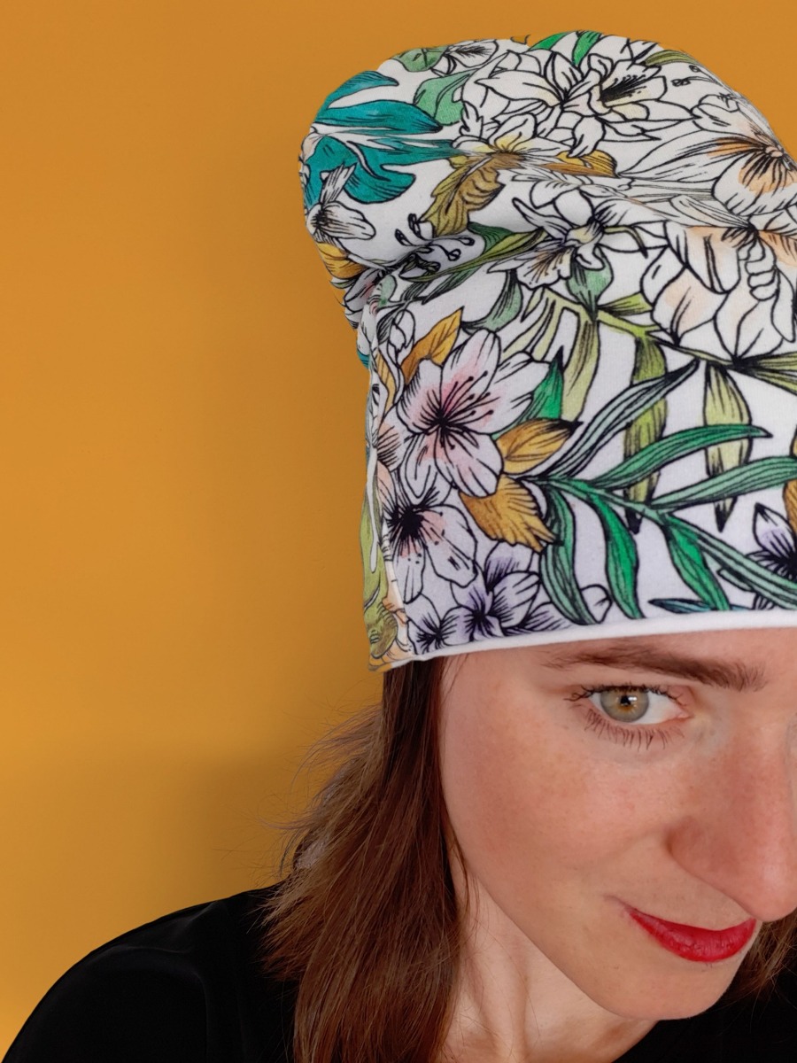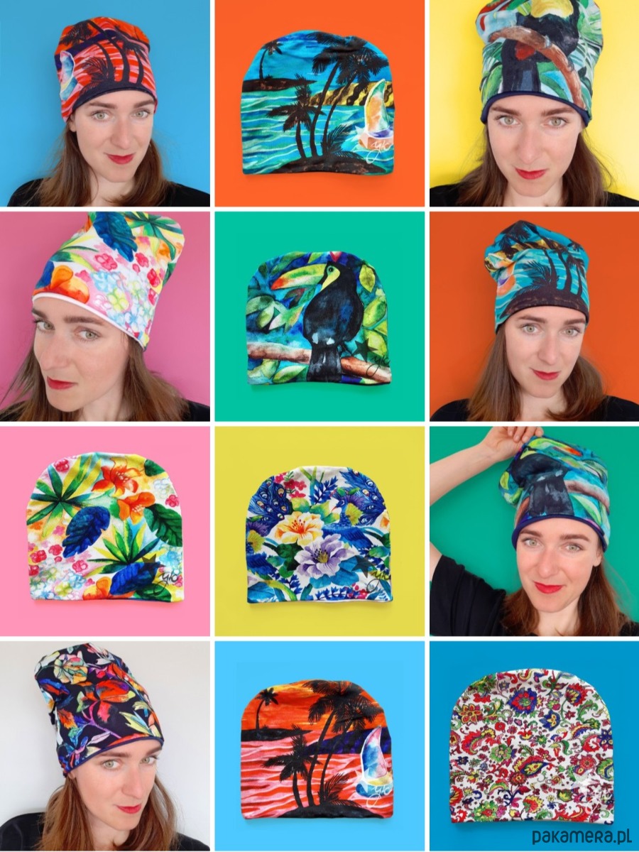 Każda sztuka ma mój własny nadruk, przeniesiony prosto z akwareli, które maluję (więc trochę jakbyś nosiła kawałek obrazu na głowie - część z nich jest jeszcze dostępna do zawieszenia na ścianie!). Robię je w mikroskopijnej ilości - od 2 do 4 sztuk - więc nie spotkasz nikogo w takiej samej!