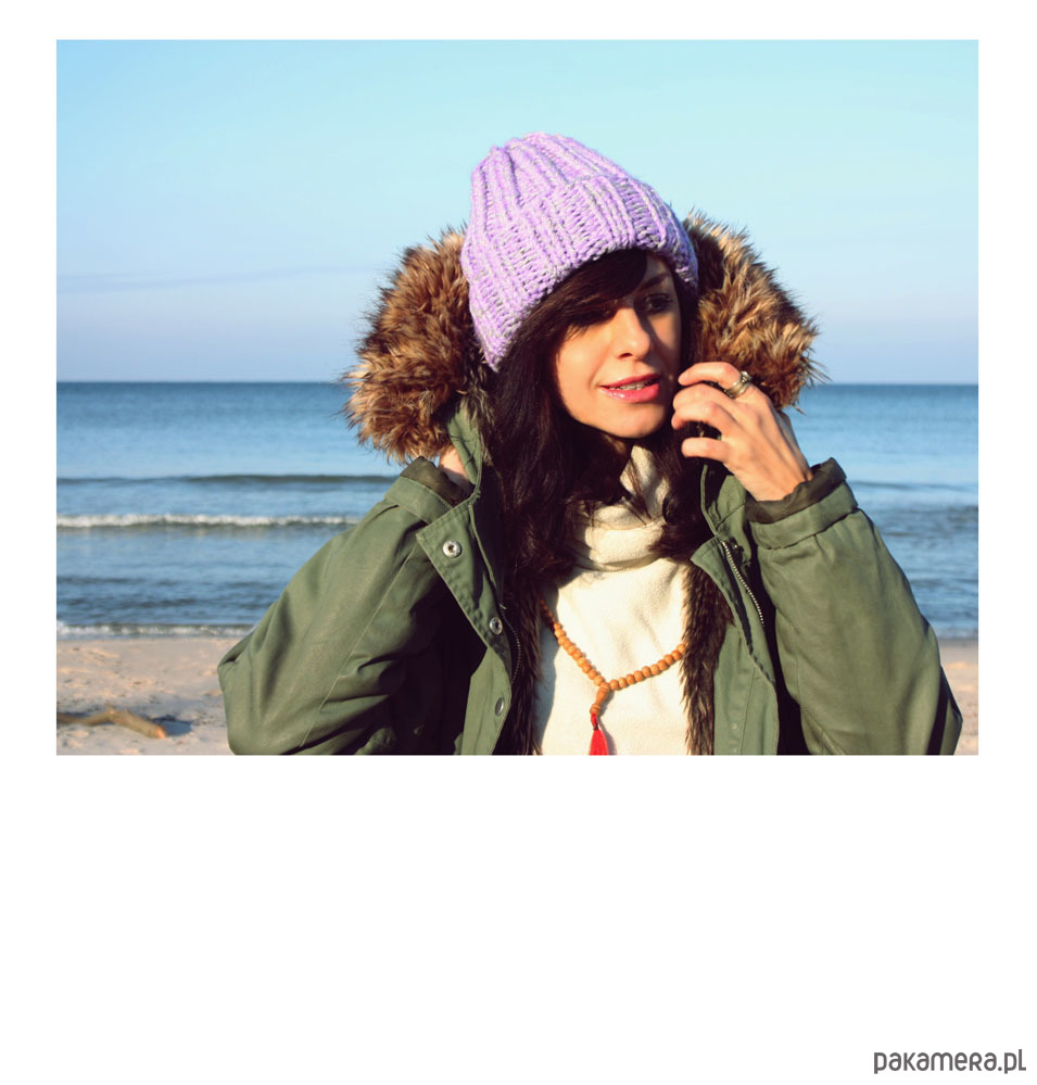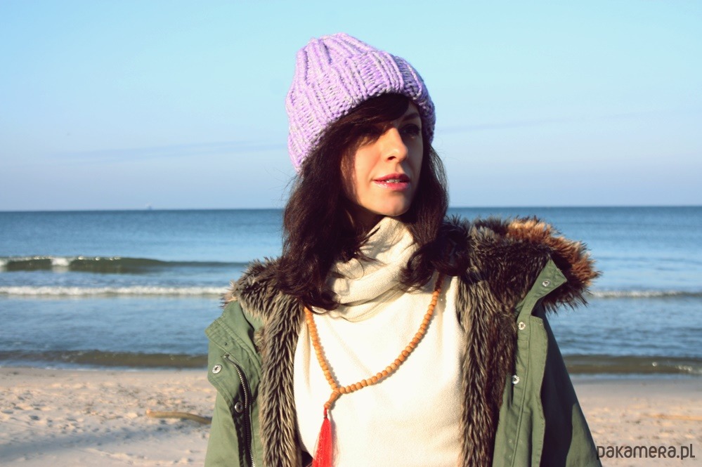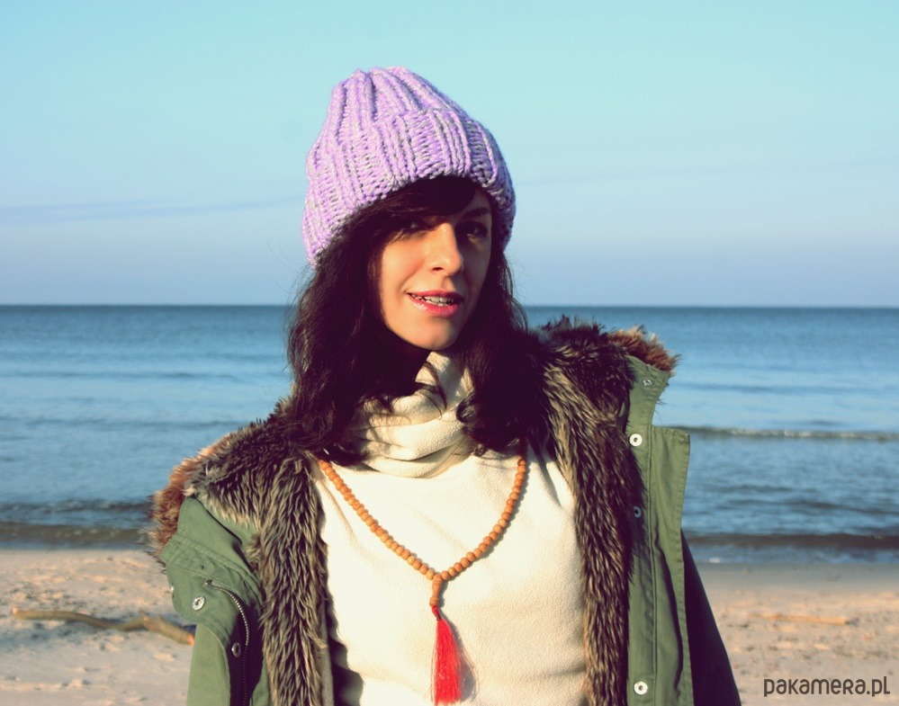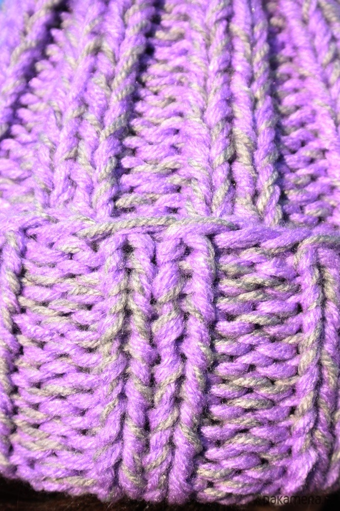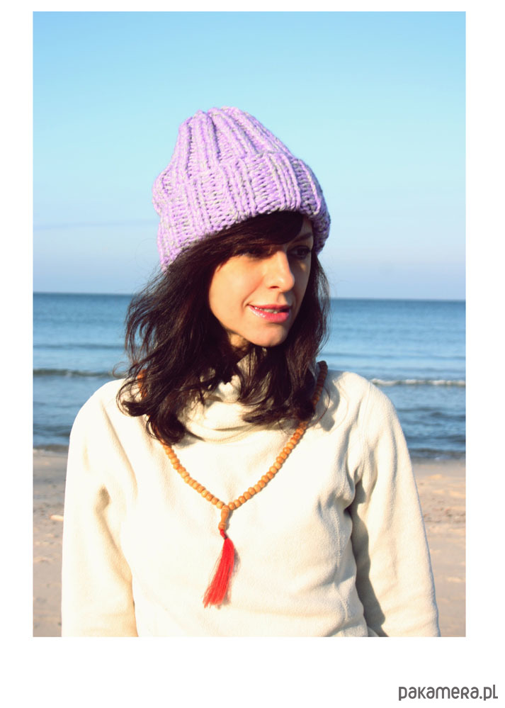 Ręcznie wykonana, gruba, mięsista czapka w kolorze pastelowego fioletu.