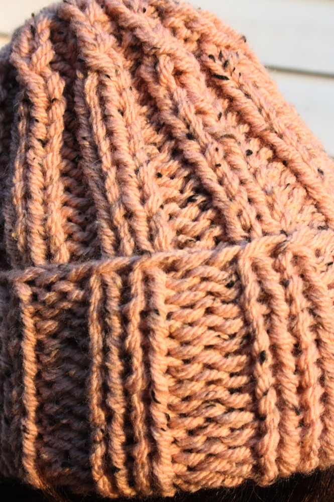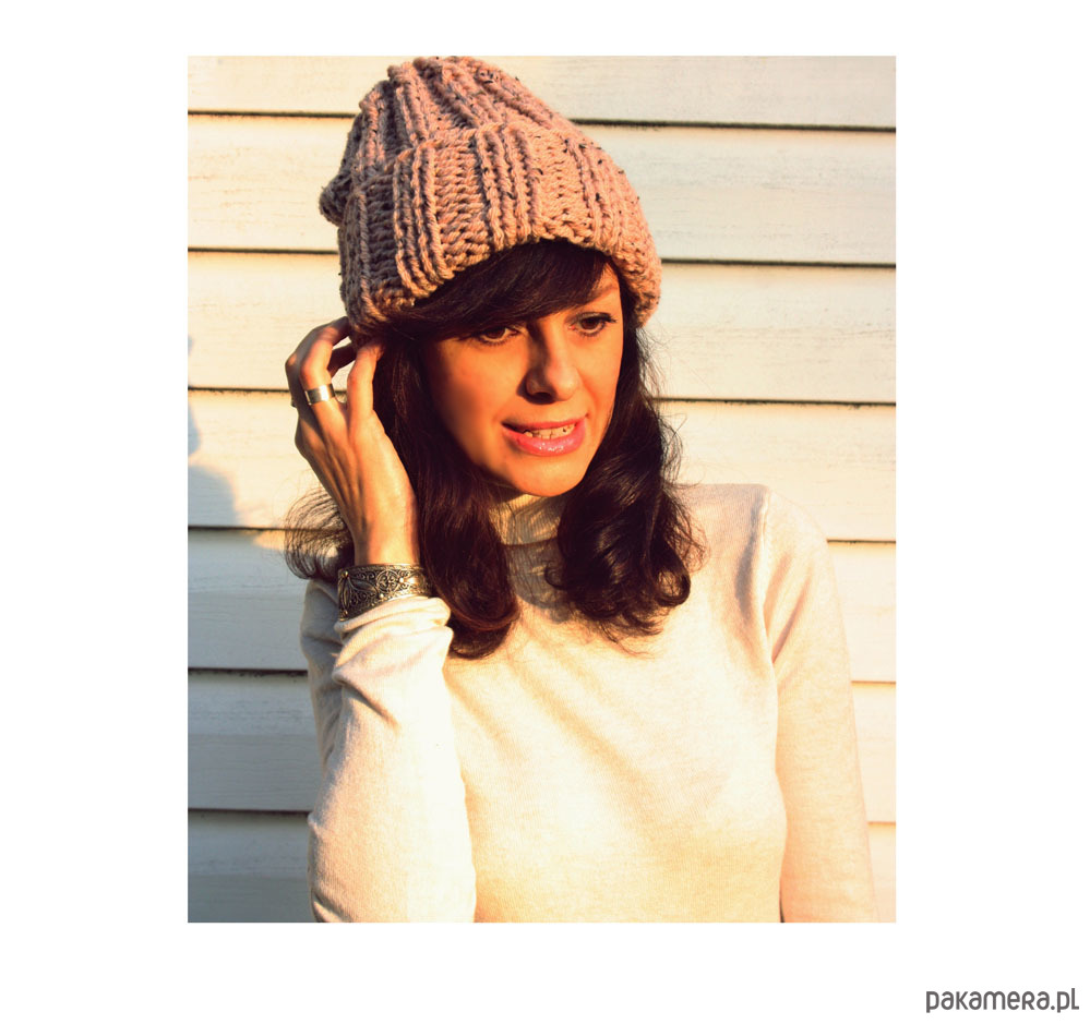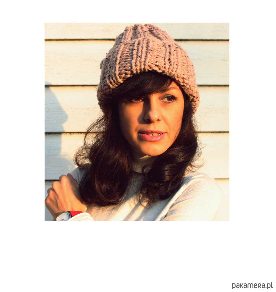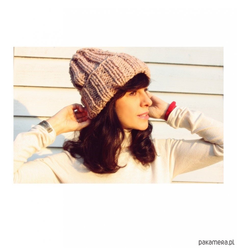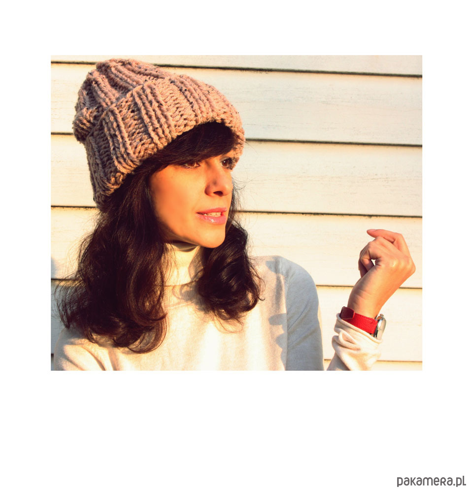 Ręcznie wykonana, gruba, mięsista czapka w kolorze pastelowego różu.