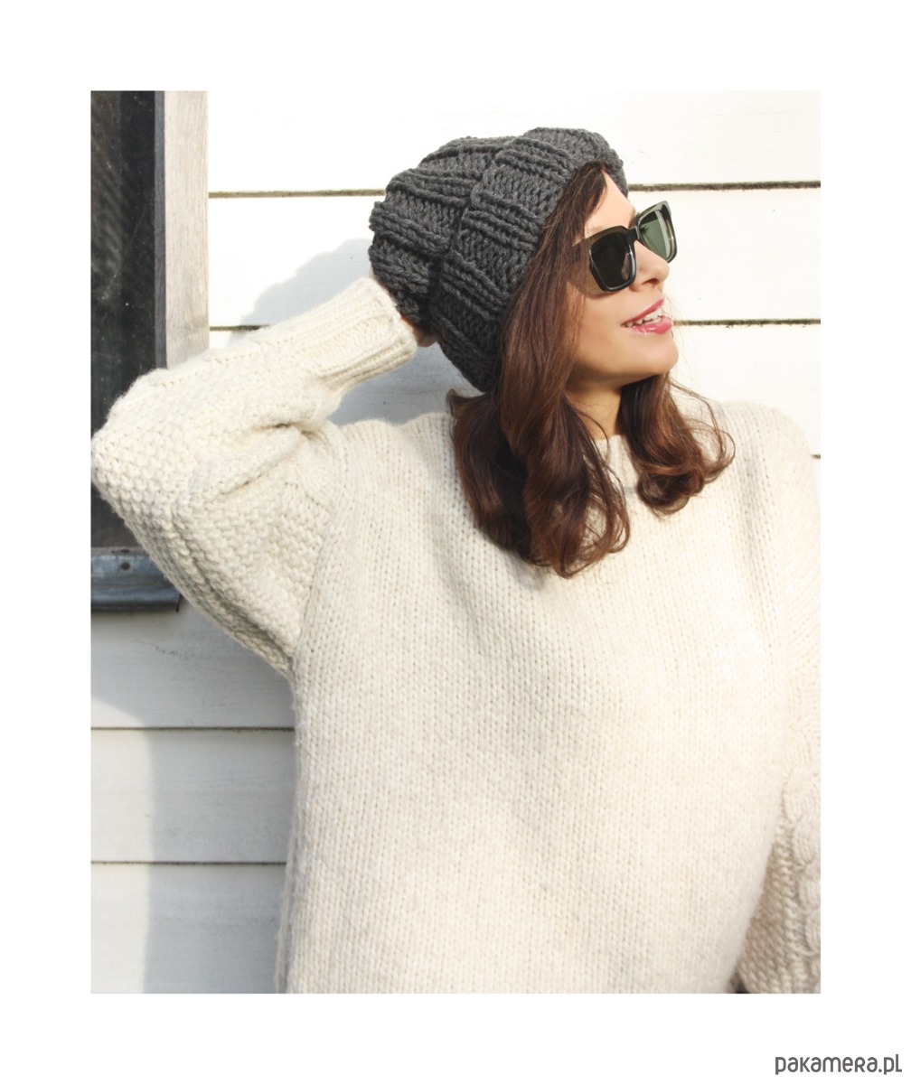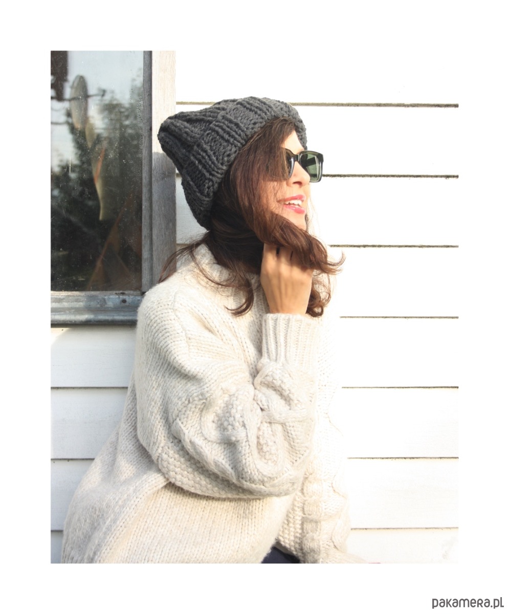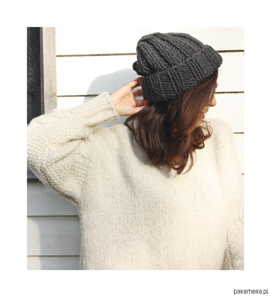 Ręcznie wykonana, gruba, "mięsista" czapka w kolorze grafitowym.