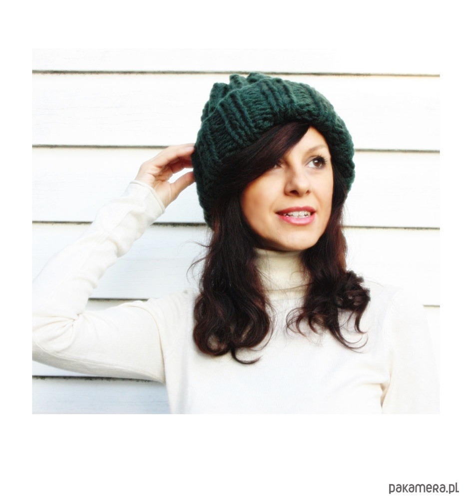 Ręcznie wykonana czapka w kolorze pięknej, butelkowej, szmaragdowej zieleni.