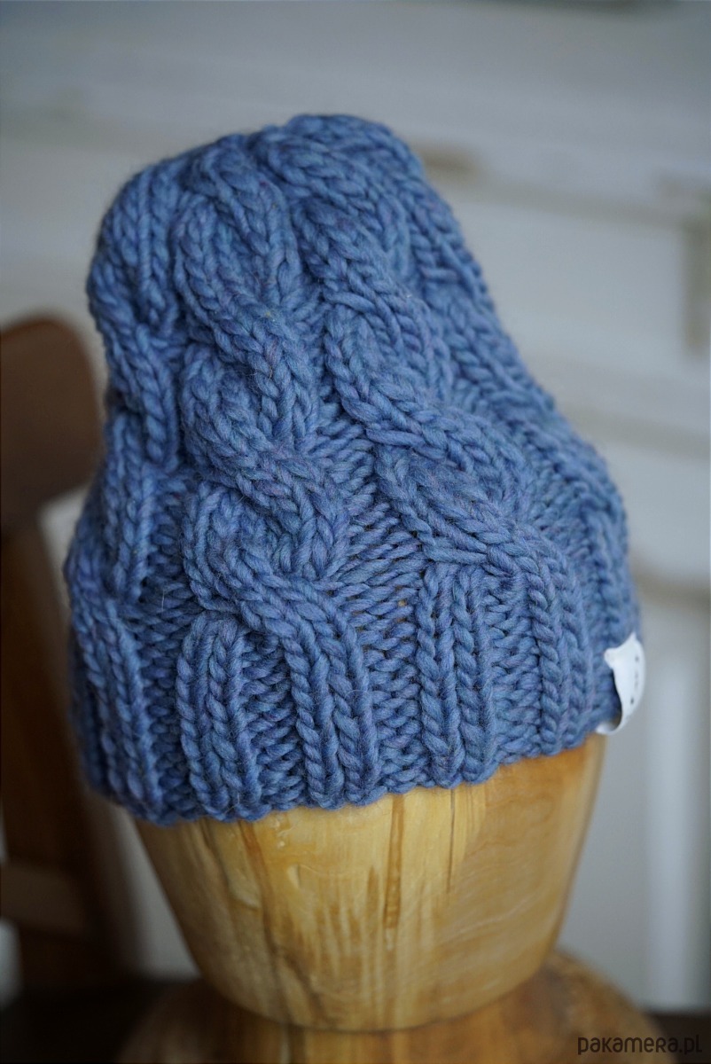 Wyjątkowo ciepła czapka w przepięknym zgaszonym odcieniu błękitu wykonana ręcznie na drutach z wełny owczej.