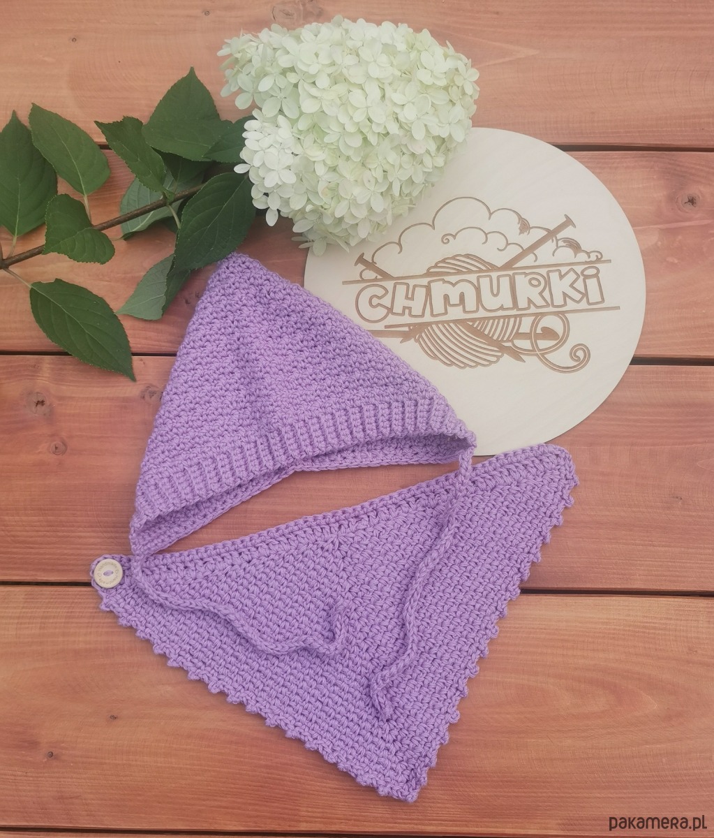 Czapka bonetka typu Elfik z bandamą regulowane zapięcie na guziczek w kolorze lawendowym