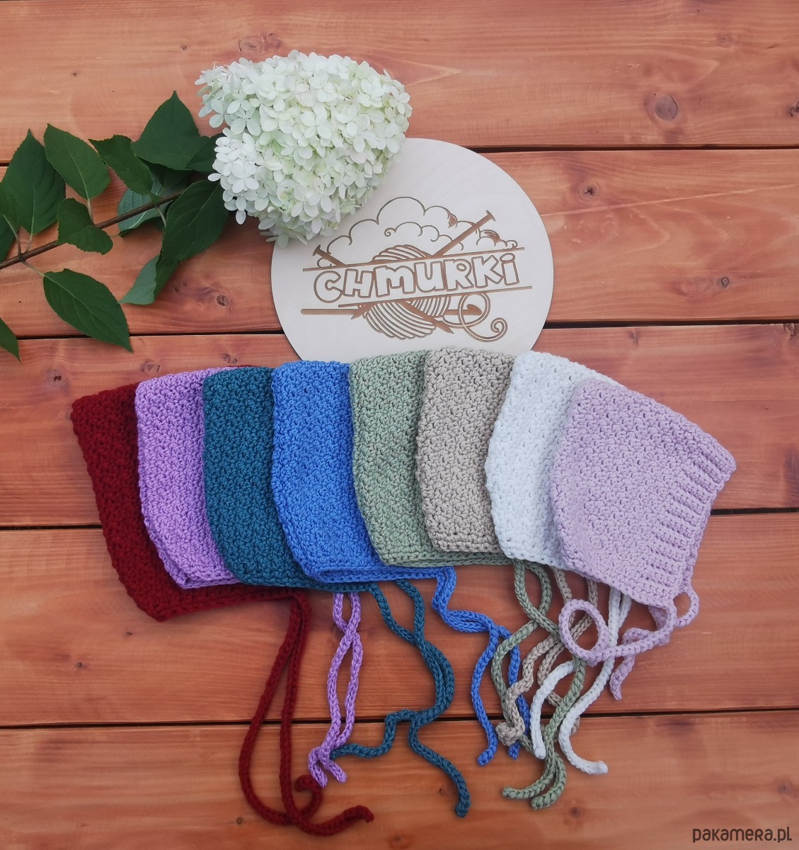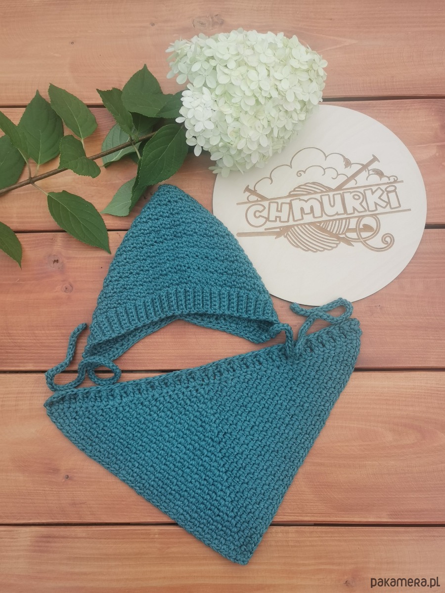 Czapka bonetka typu Elfik z bandamą regulowane zapięcie na guziczek w kolorze morskim.