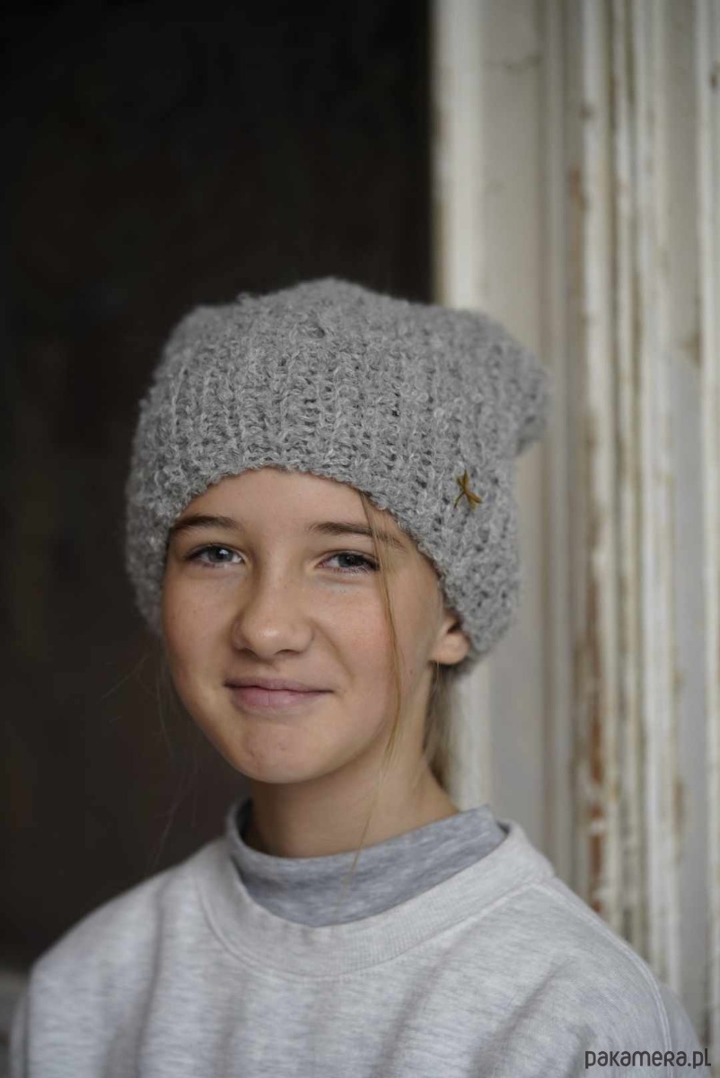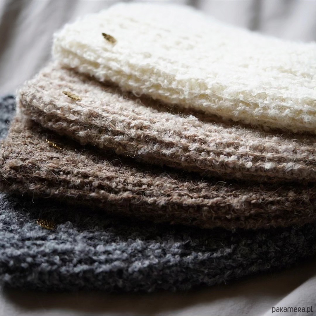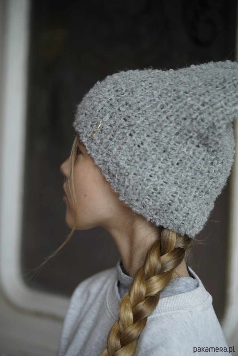Czapka ze 100% włóczki alpaki z gatunku boucle, jej struktura w dotyku przypomina pluszowego misia,