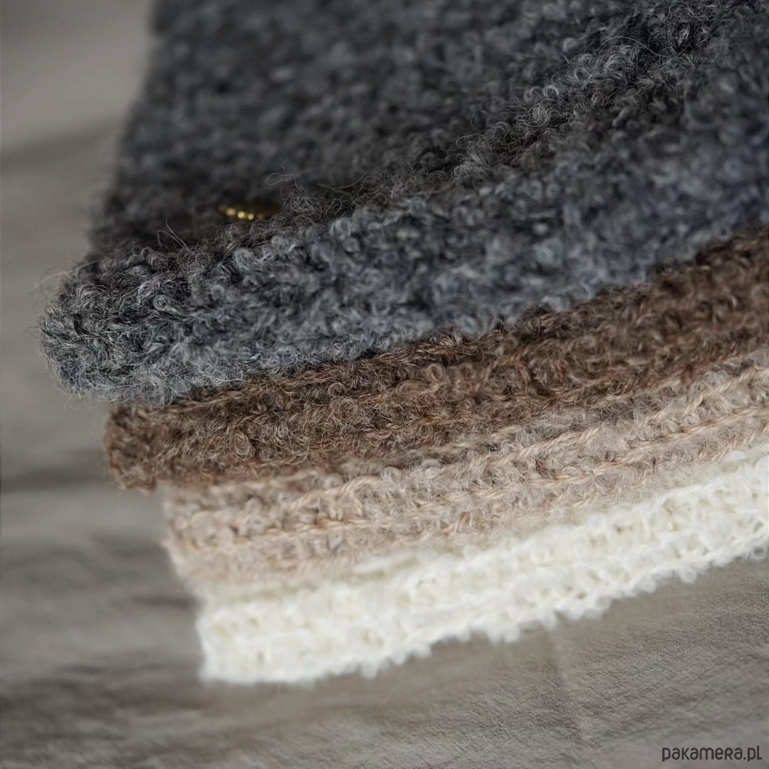 Czapka ze 100% włóczki alpaki z gatunku boucle, jej struktura w dotyku przypomina pluszowego misia,