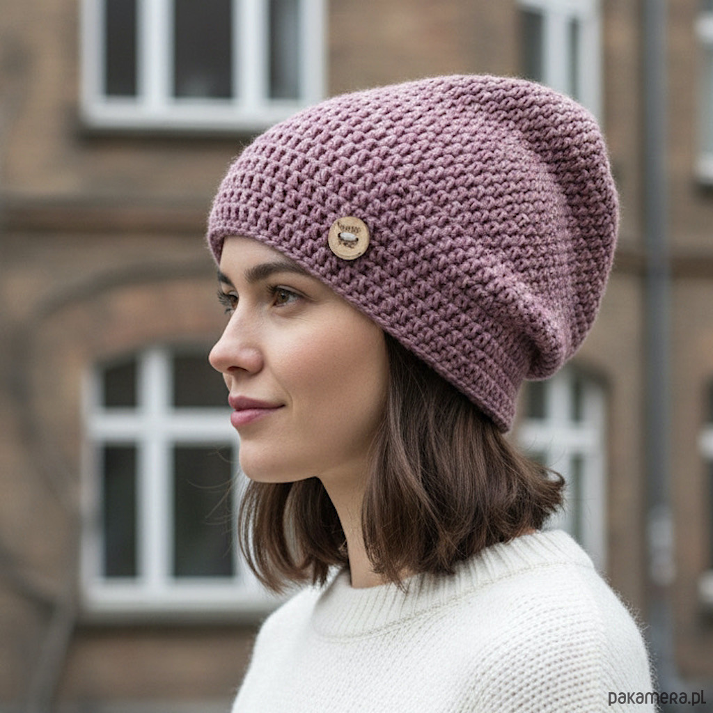 Czapkę przejściową wykonałam z wysokiej jakości włóczki bawełniano-akrylowej, która zapewnia wygodę noszenia przez cały dzień.