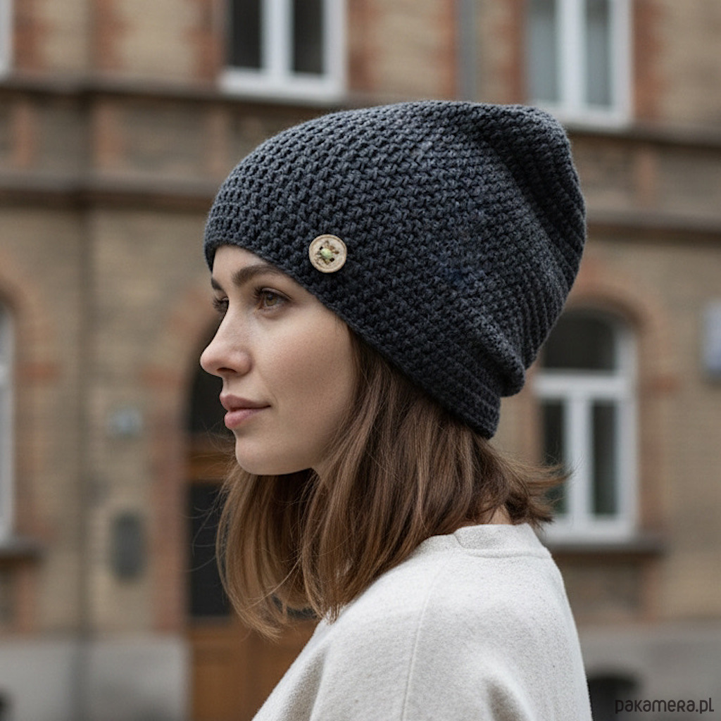 Czapkę przejściową wykonałam z wysokiej jakości włóczki bawełniano-akrylowej, która zapewnia wygodę noszenia przez cały dzień.