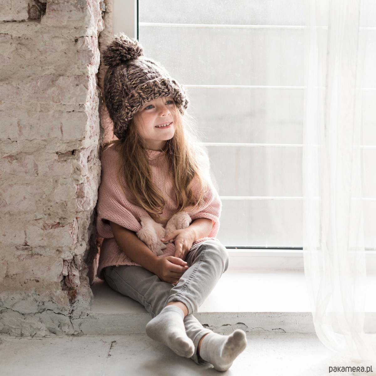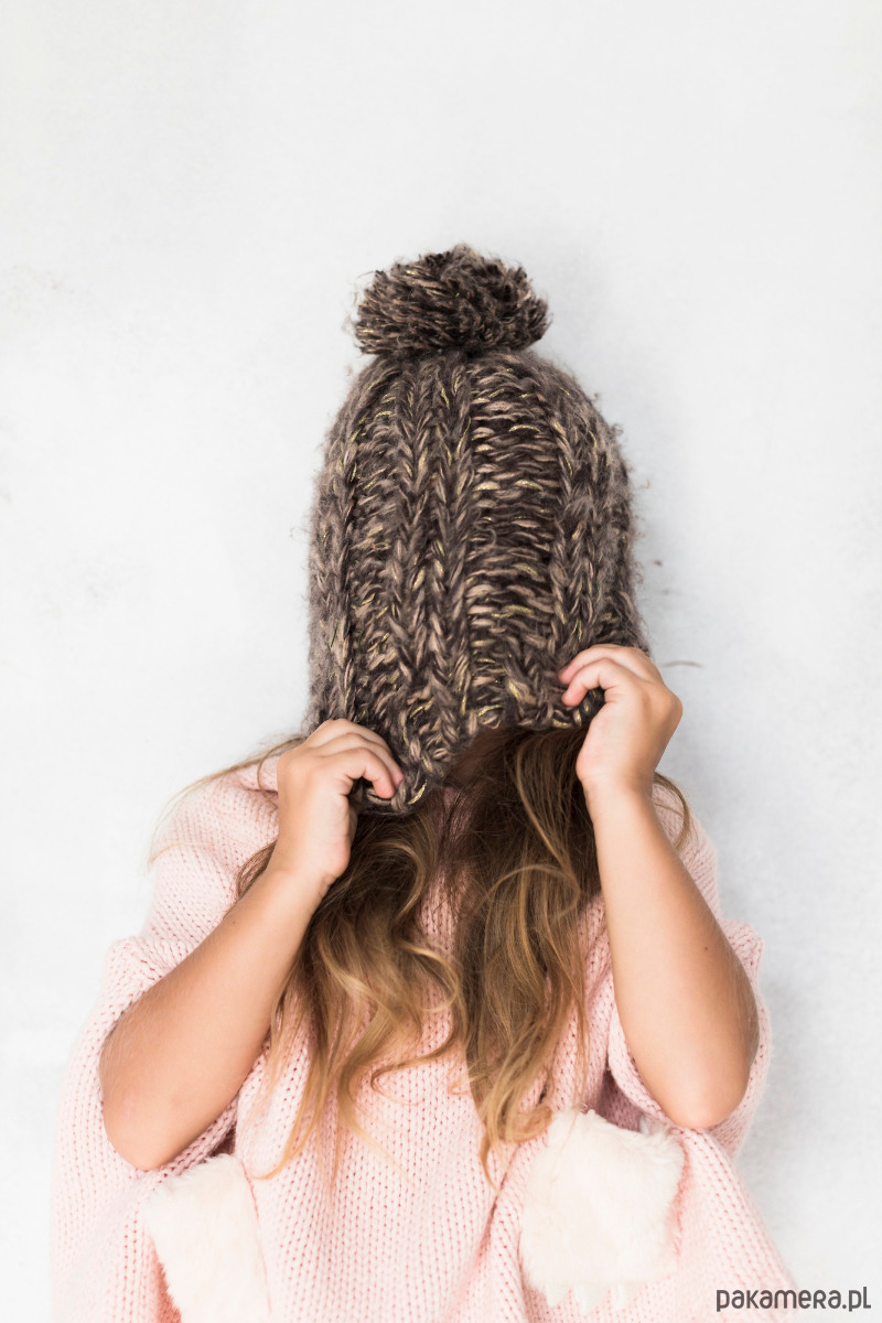 Ciepła, miękka czapka dziecięca wykonana ręcznie na drutach (melanż dwóch rodzajów włóczek).
