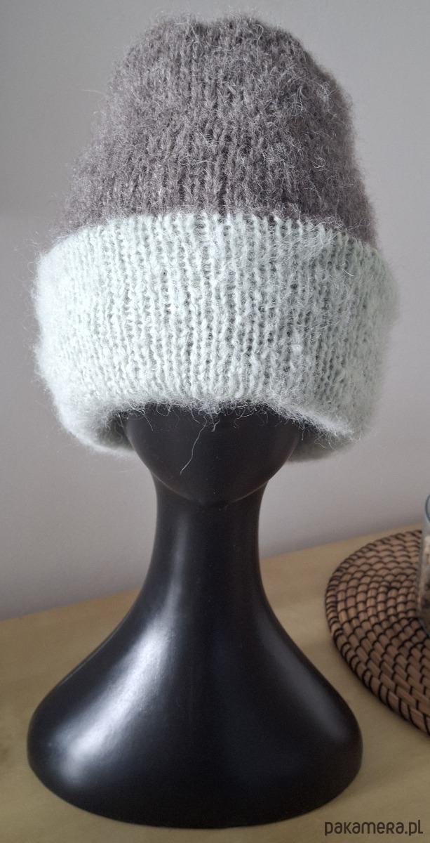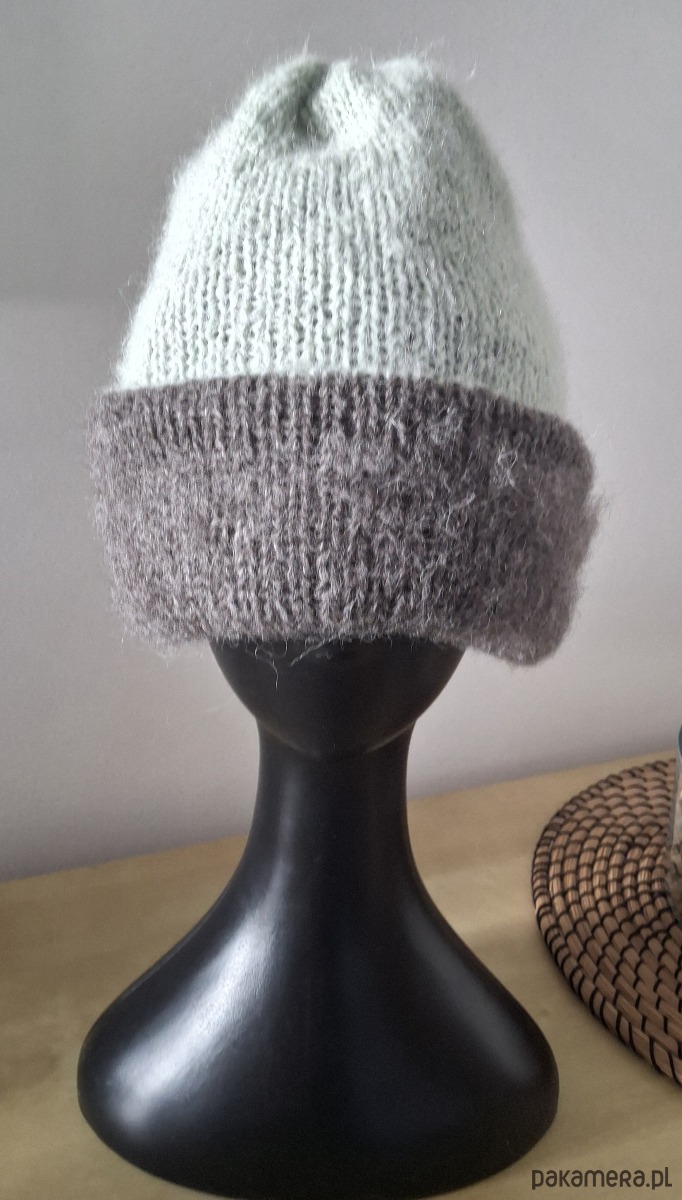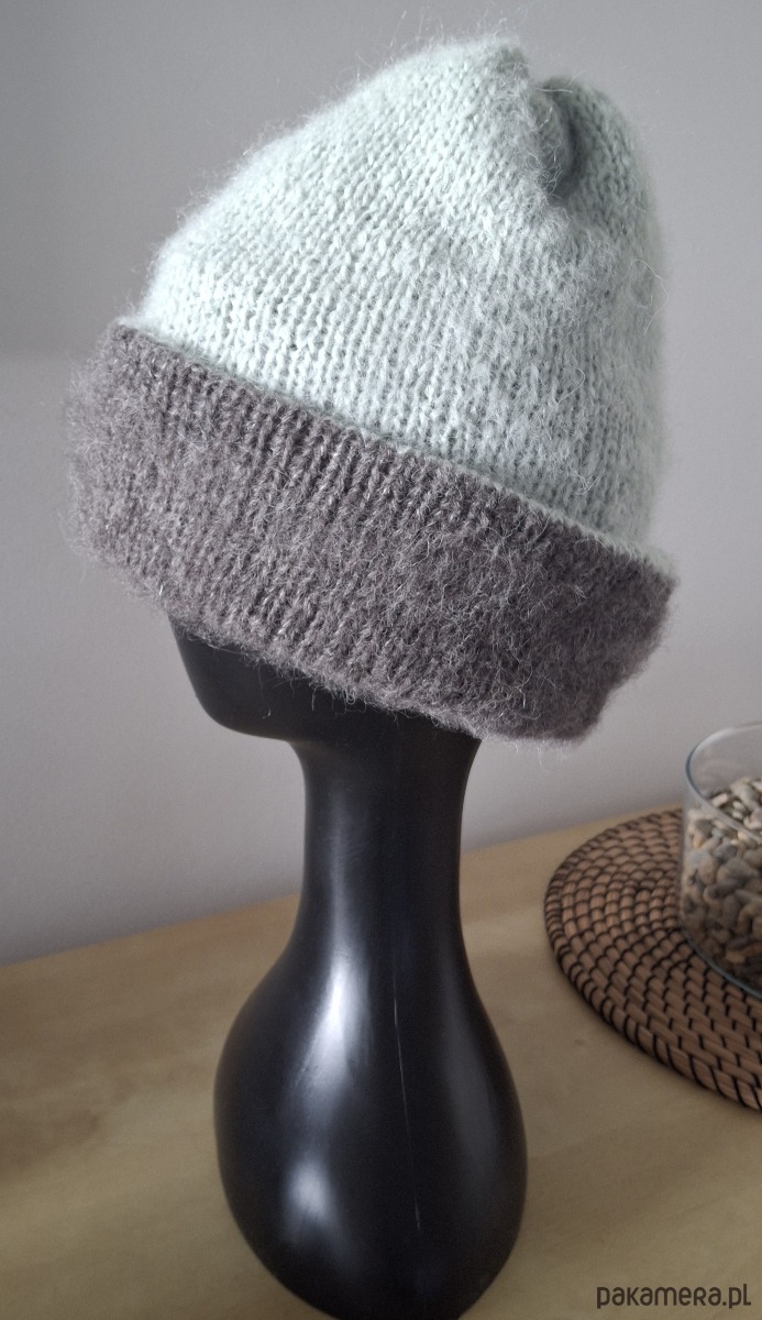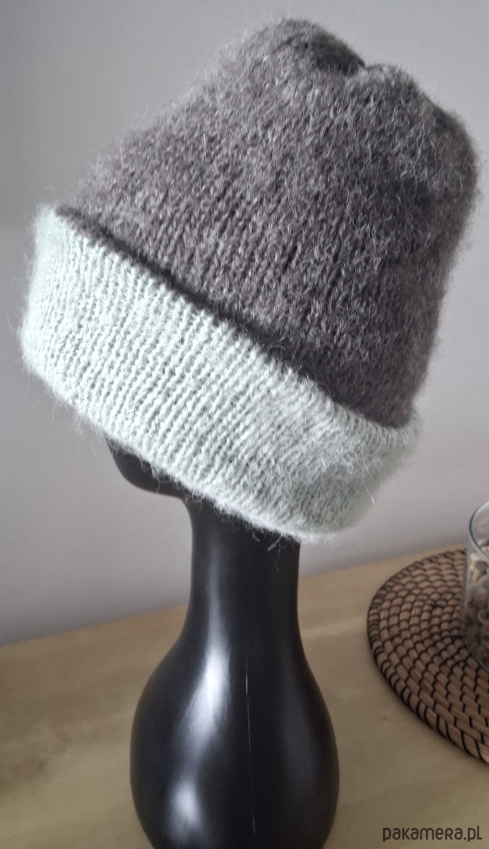Czapka zrobiona ręcznie na drutach z włóczki wysokiej jakości (71 %alpaca, 25% wełna, 4% poliamid). Czapka dwustronna, z jednej strony jest w kolorze miętowym, z drugiej w ciemno szarym. Czapka podwójna, ciepła, puszysta i nie gryzie.
