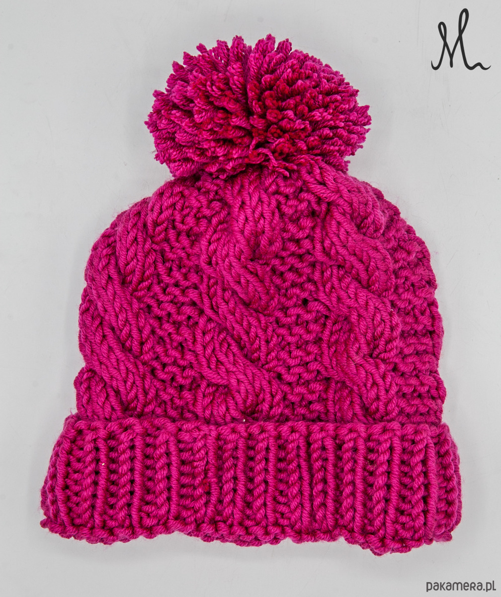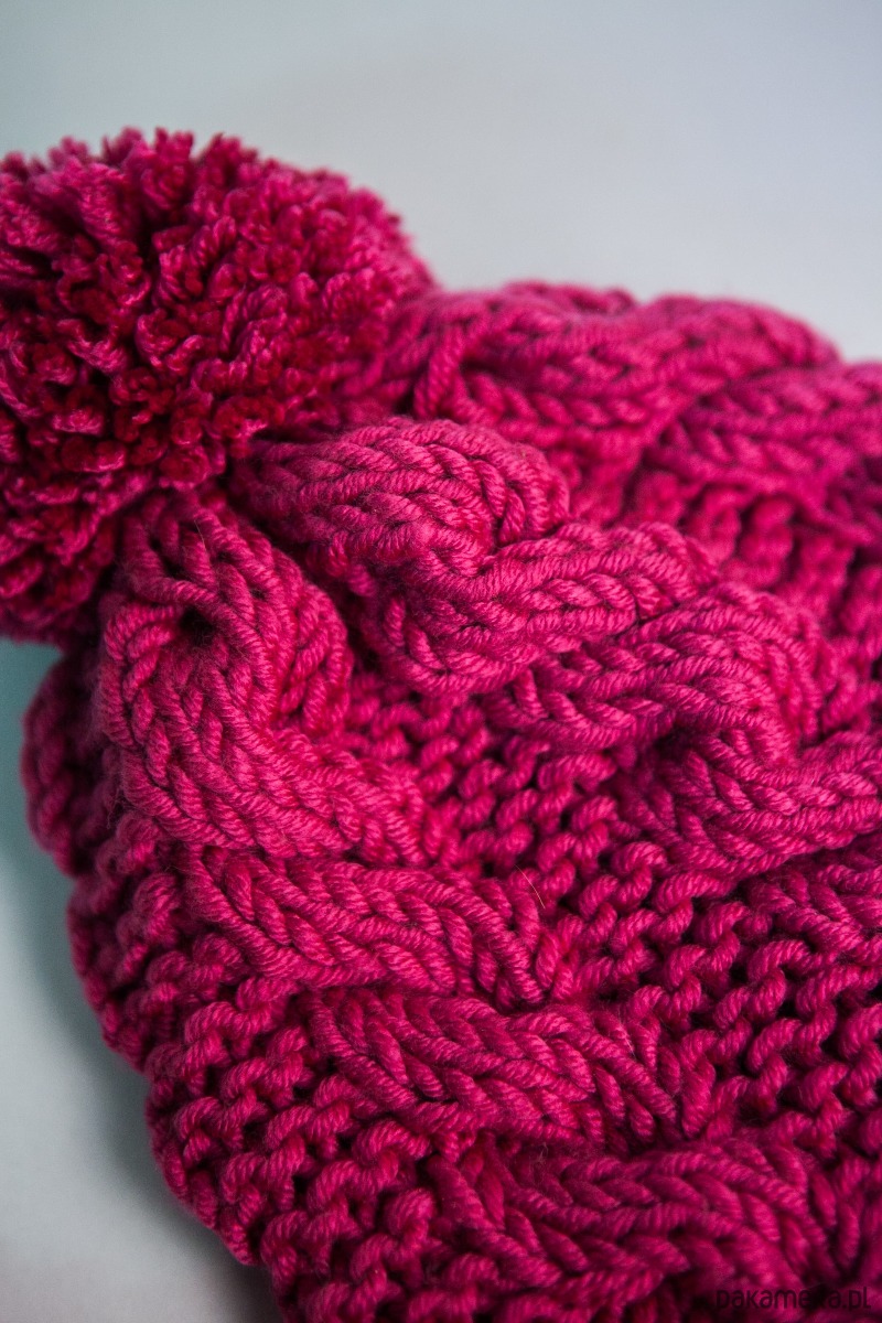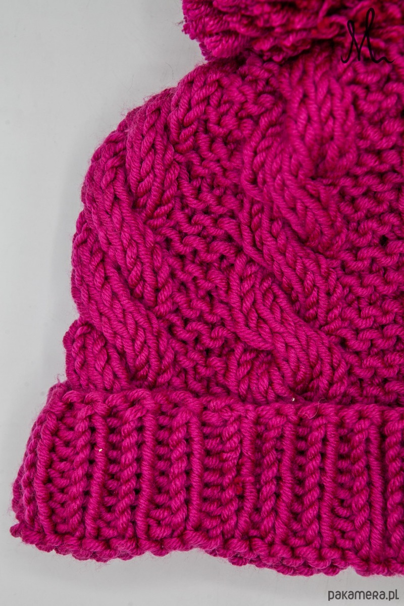 Czapka wykonana bezszwowo i zakończona dużym pomponem. Czapkę wydziergałam na drutach wzorem z warkoczami. Włóczka jest miękka i miła w dotyku, w wyrobie sprężysta i ciepła. Nie "gryzie":)