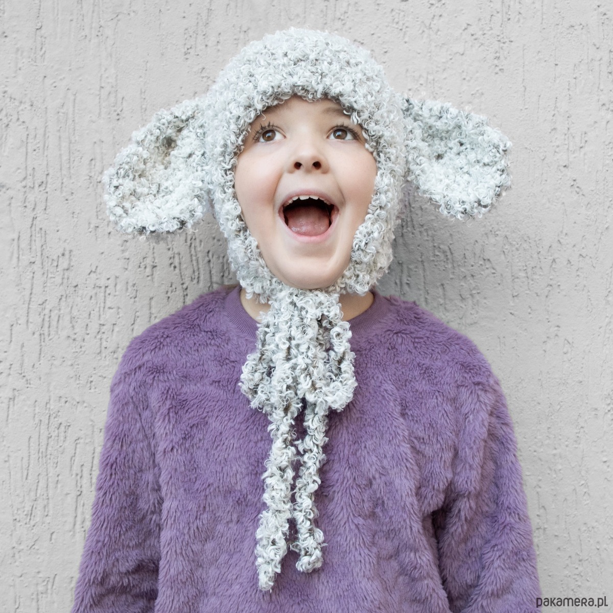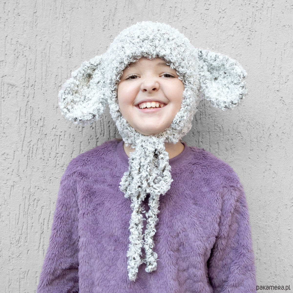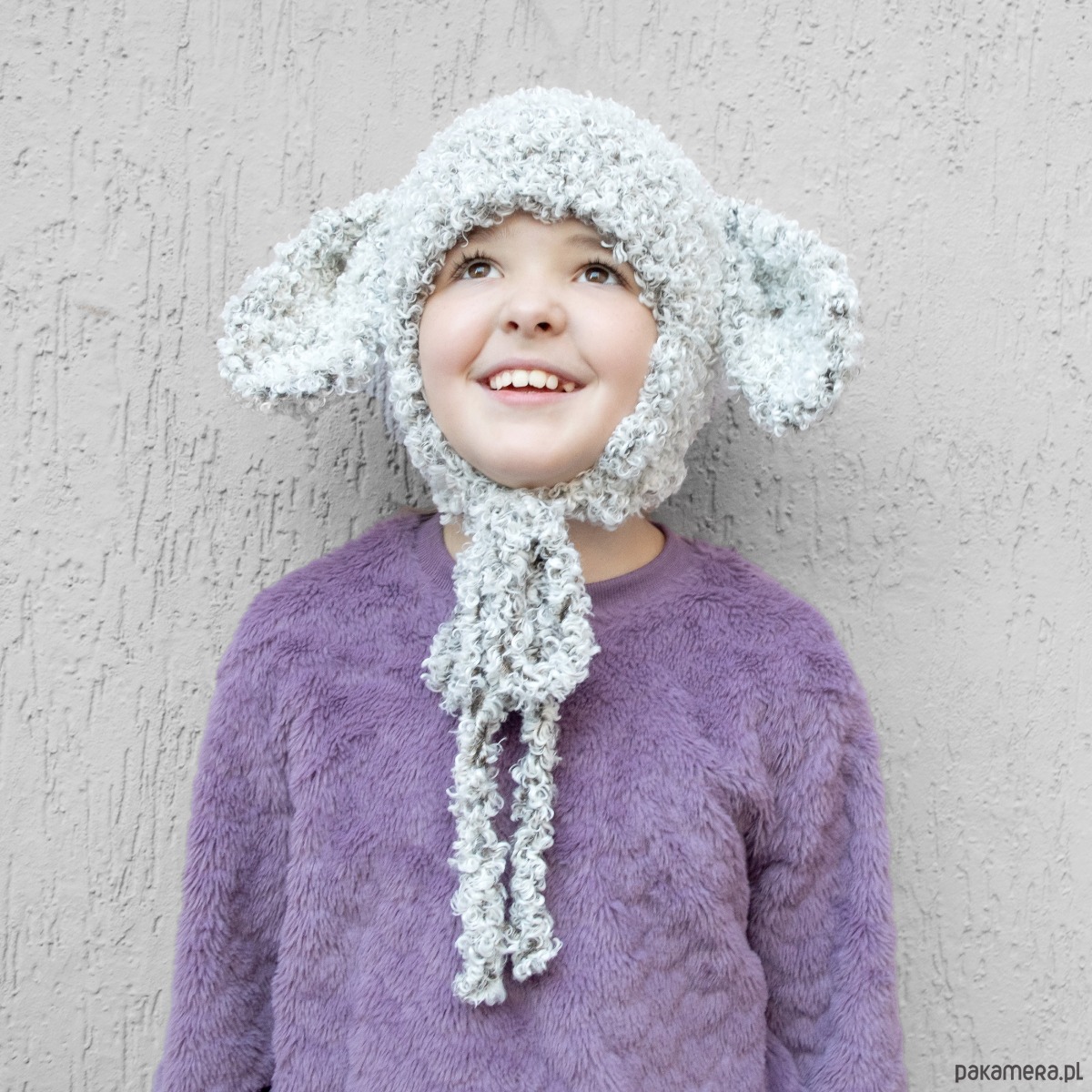 Czapka ręcznie robiona z bardzo miłej w dotyku włóczki. Biały kolor mieszany z czarnym, mały baranek z dwoma uszami. Z 100% poliestrowej włóczki