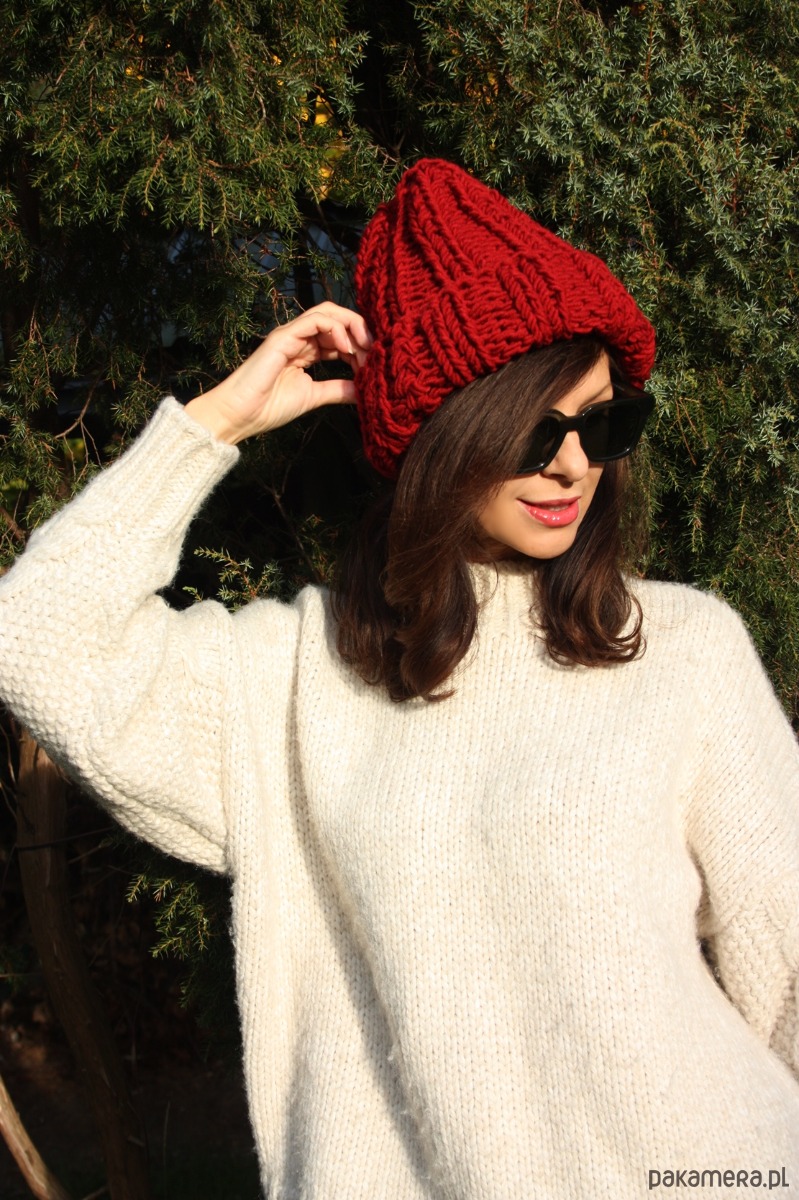 Ręcznie wykonana, gruba, mięsista czapka w kolorze ciemnej czerwieni.