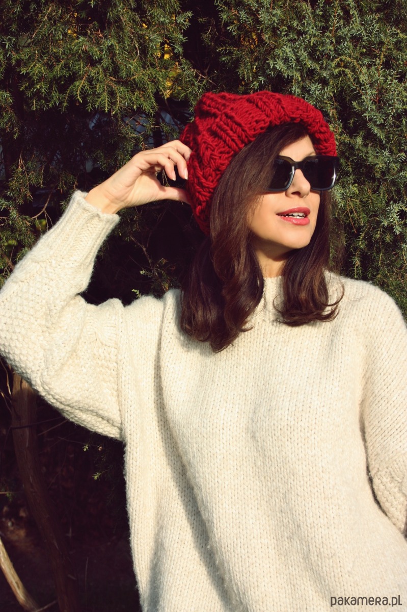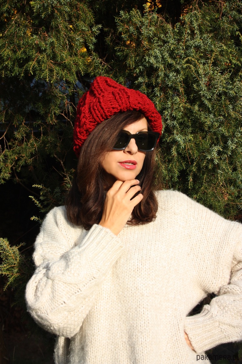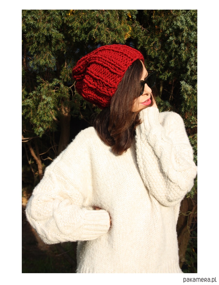 Ręcznie wykonana, gruba, mięsista czapka w kolorze ciemnej czerwieni.