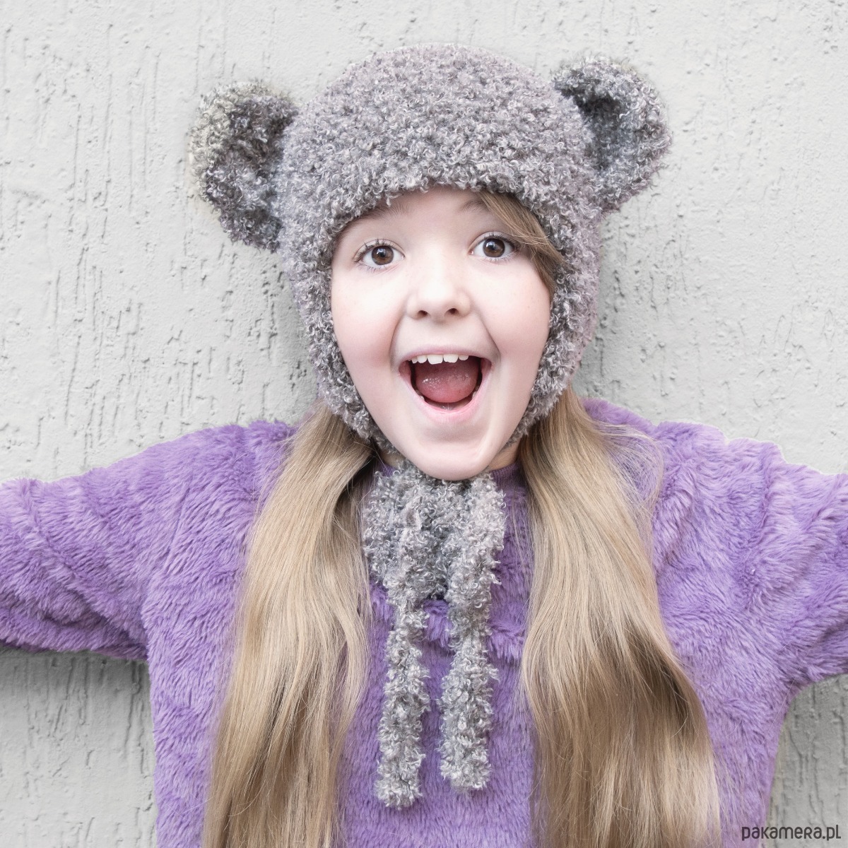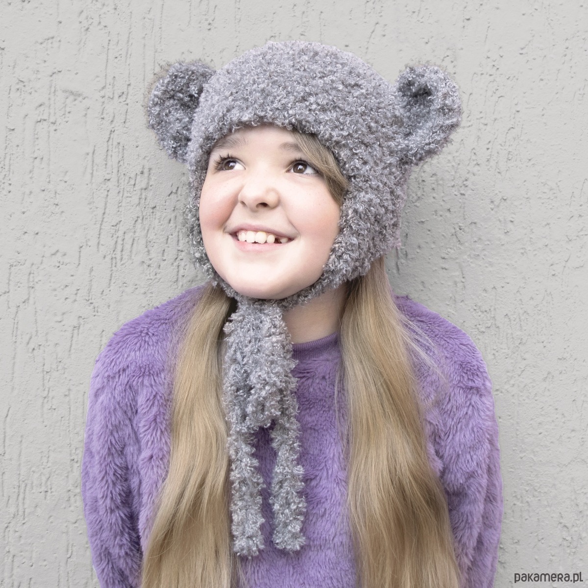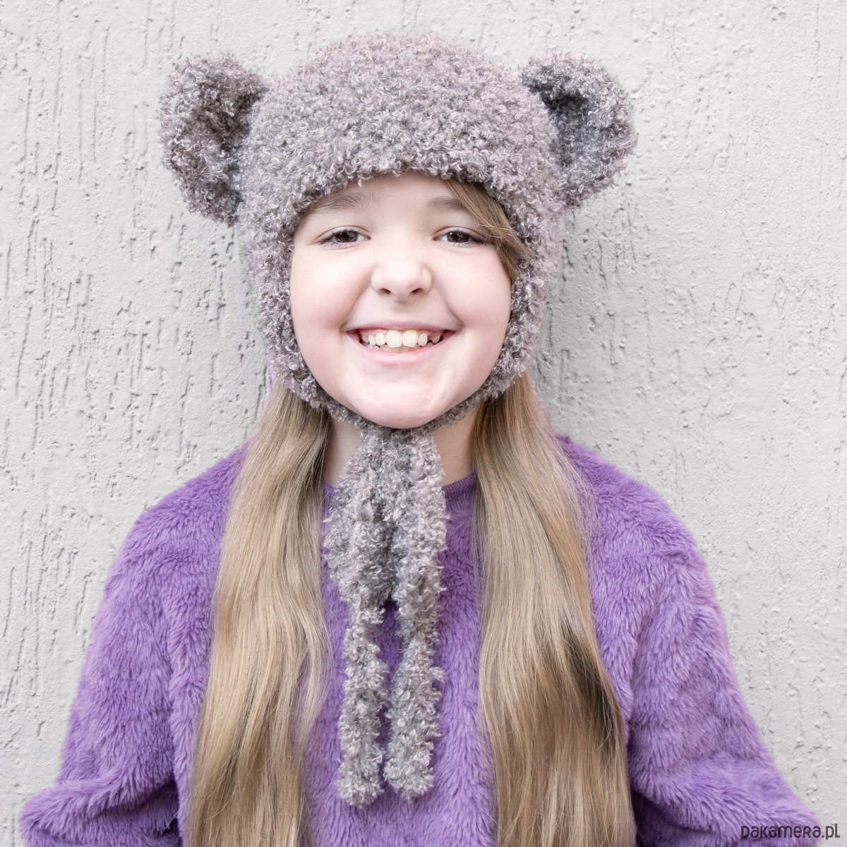 Czapka ręcznie robiona z bardzo miłej w dotyku włóczki. Brązowy kolor, mały miś z dwoma uszami. Z 100% poliestrowej włóczki