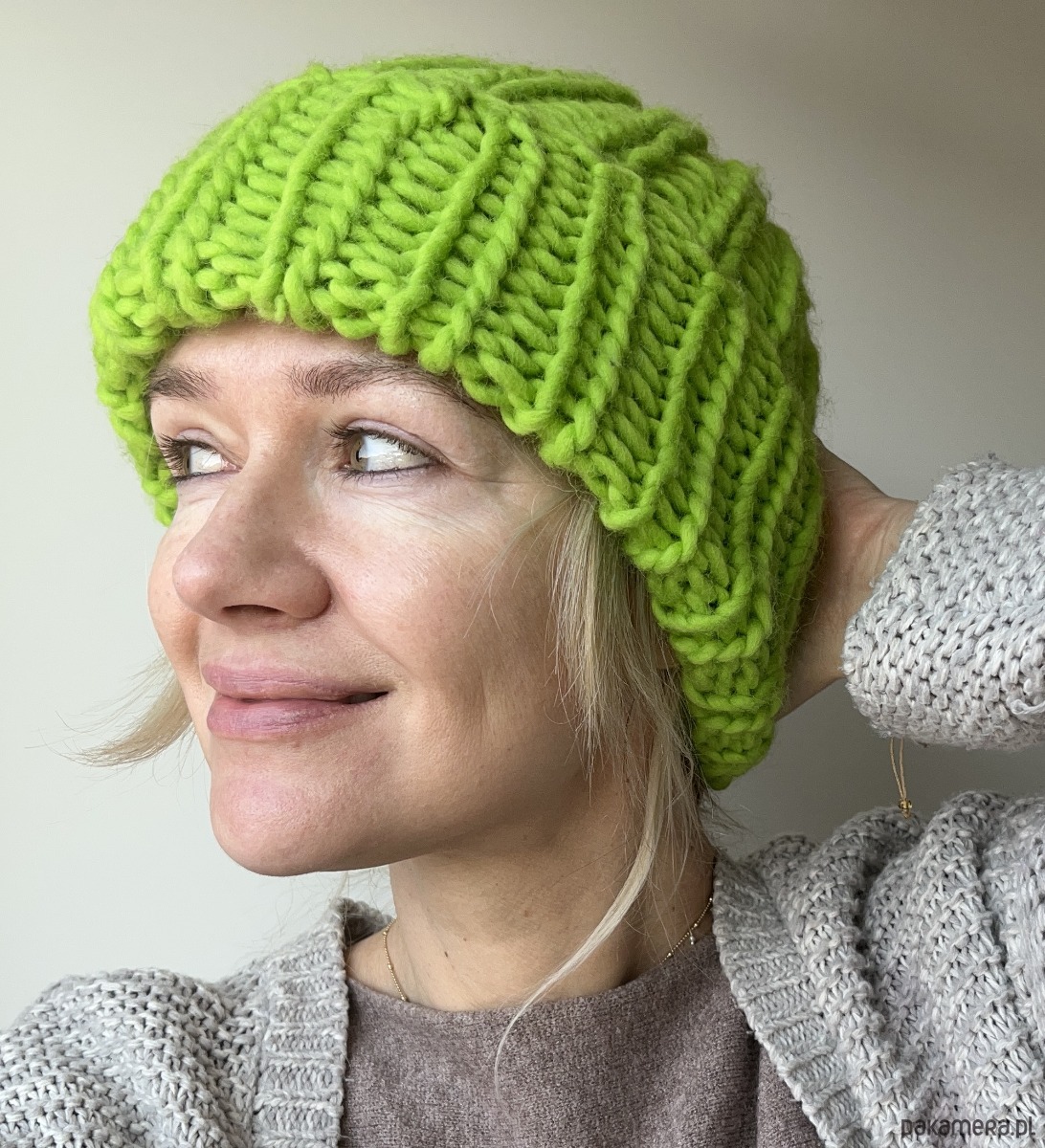 Zrobiona przeze mnie na drutach z bardzo grubej włóczki (mieszanka akrylu i wełny) czapka.