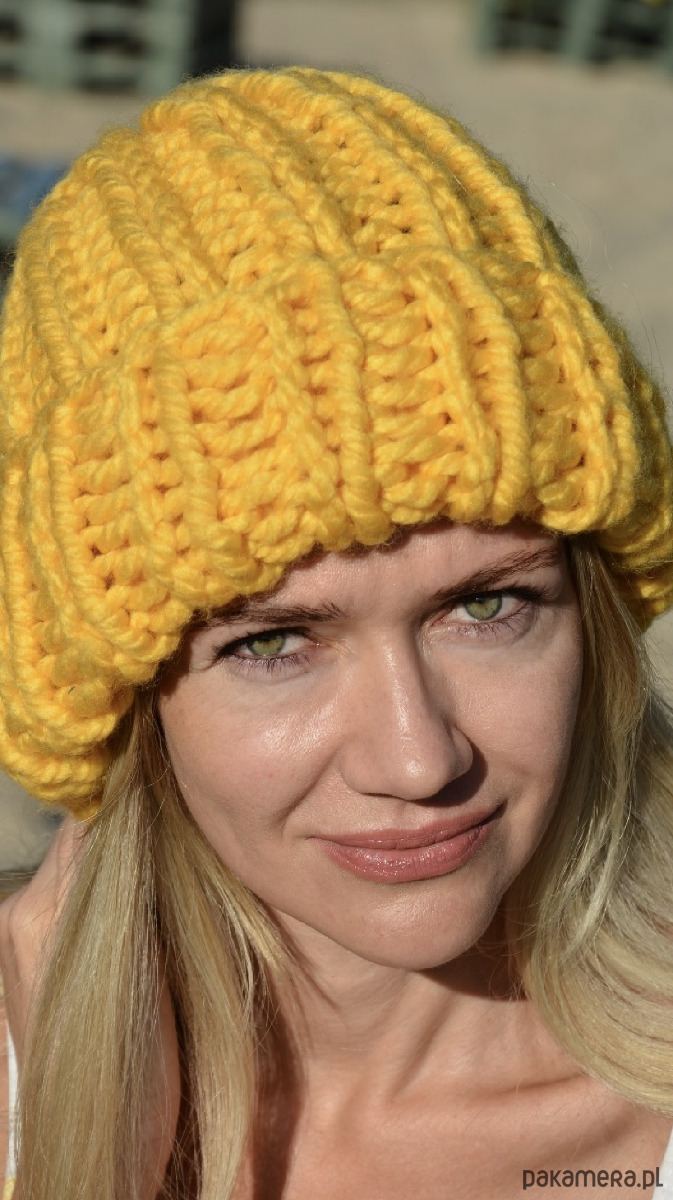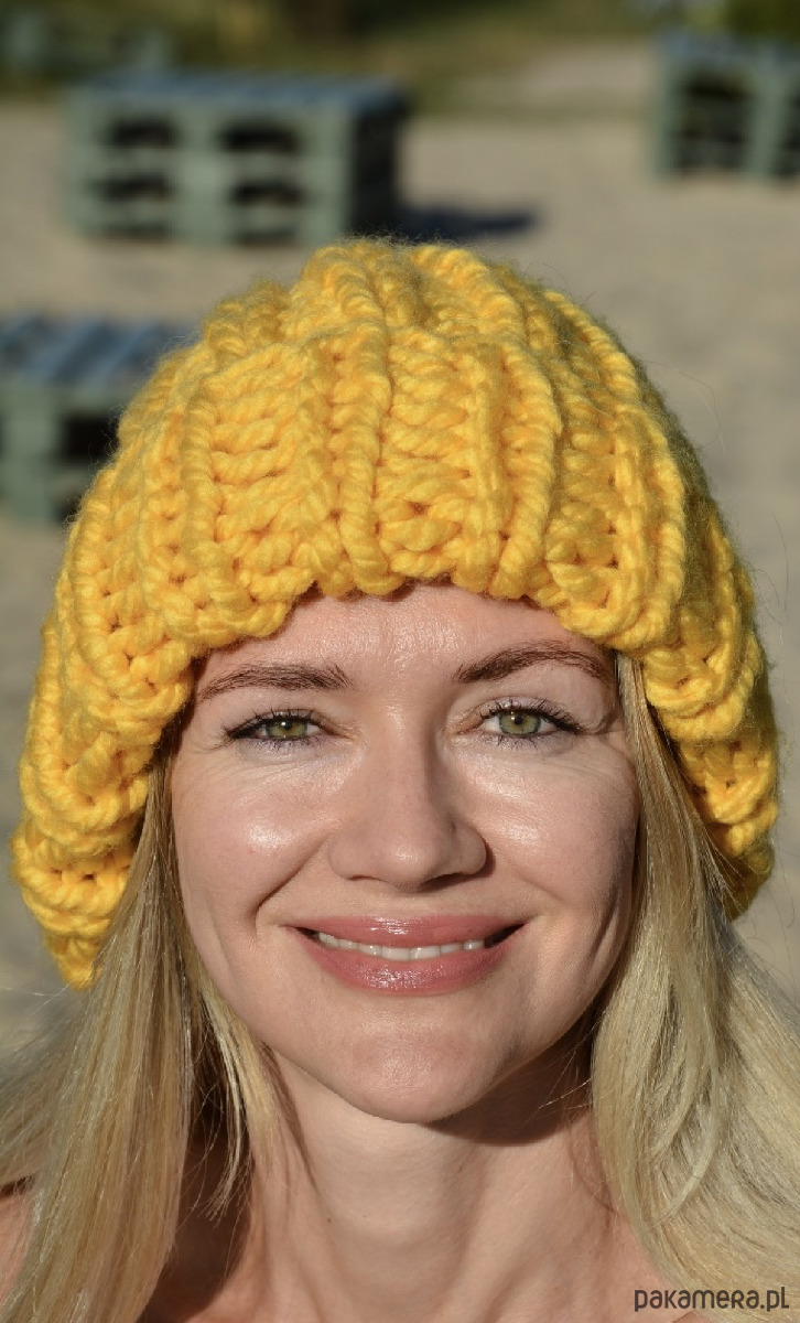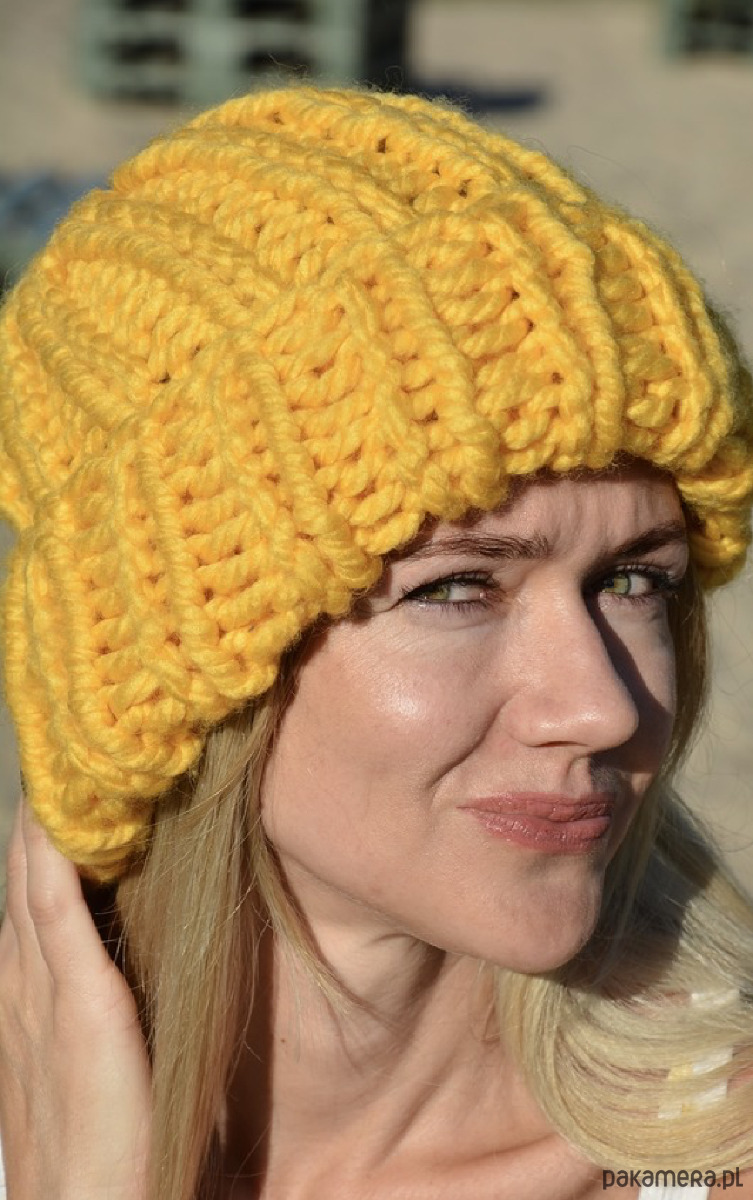 Zrobiona przeze mnie na drutach z bardzo grubej włóczki czapka.