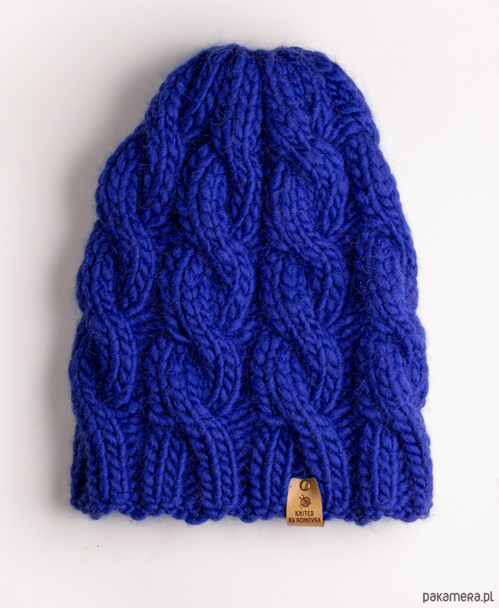 Czapka kobalt Szlachetna wełna merino Bardzo miękka Warkocz