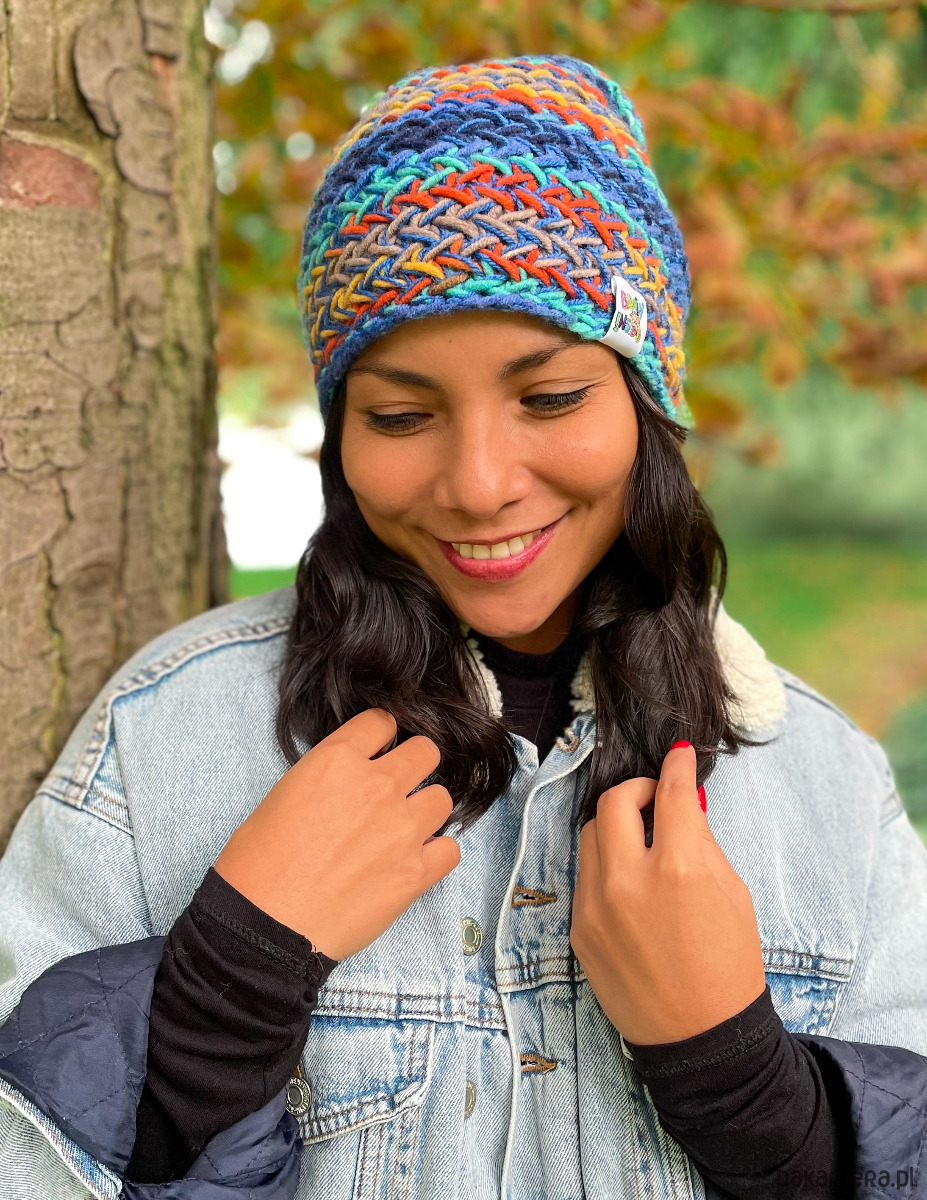 Ręcznie robiona przez poznańskie Seniorki z mieszanki 50% merino i 50% akrylu, jest miękka, ciepła i oddychająca – bez pompona, bez polaru, za to z charakterem. Luźna i lekko zwisająca, ma ten nonszalancki vibe, który sprawia, że wygląda dobrze zarówno na spacerze po mieście, jak i podczas weekendowej wyprawy za miasto.