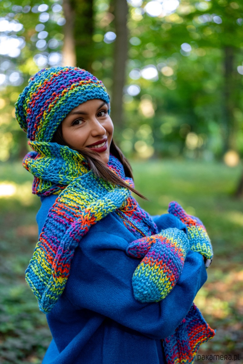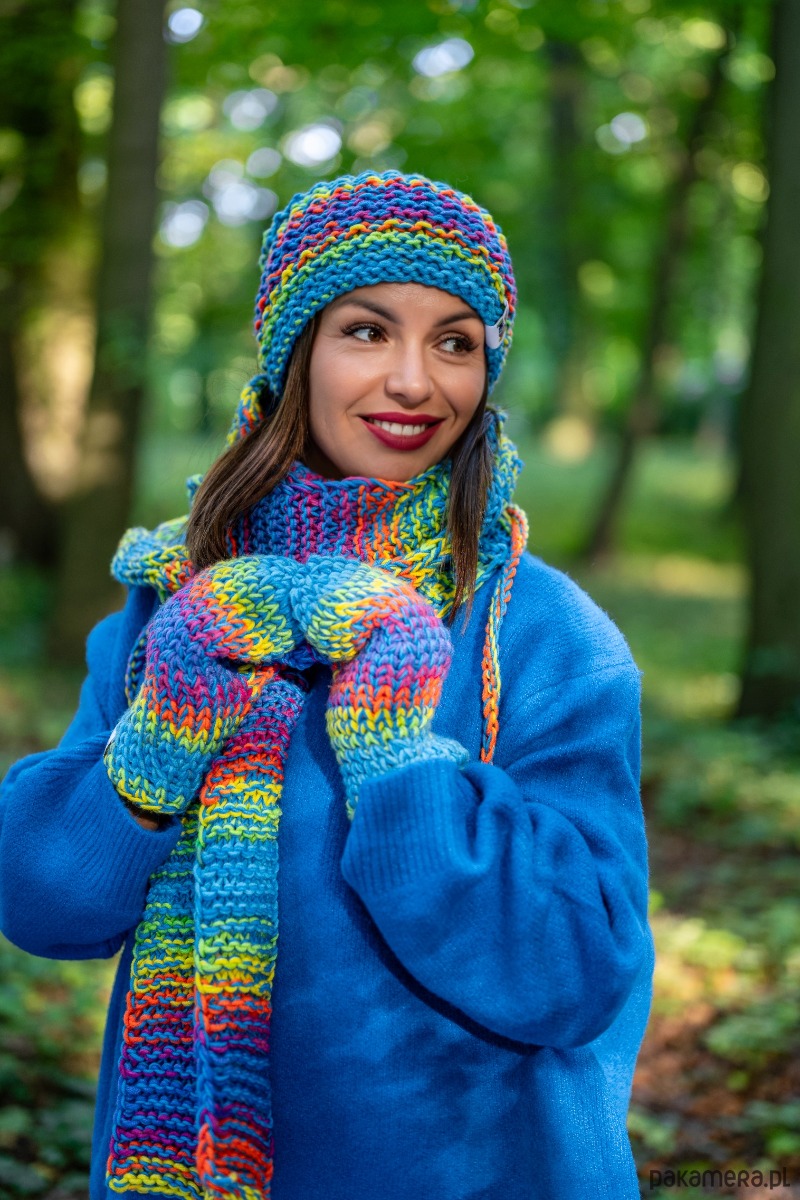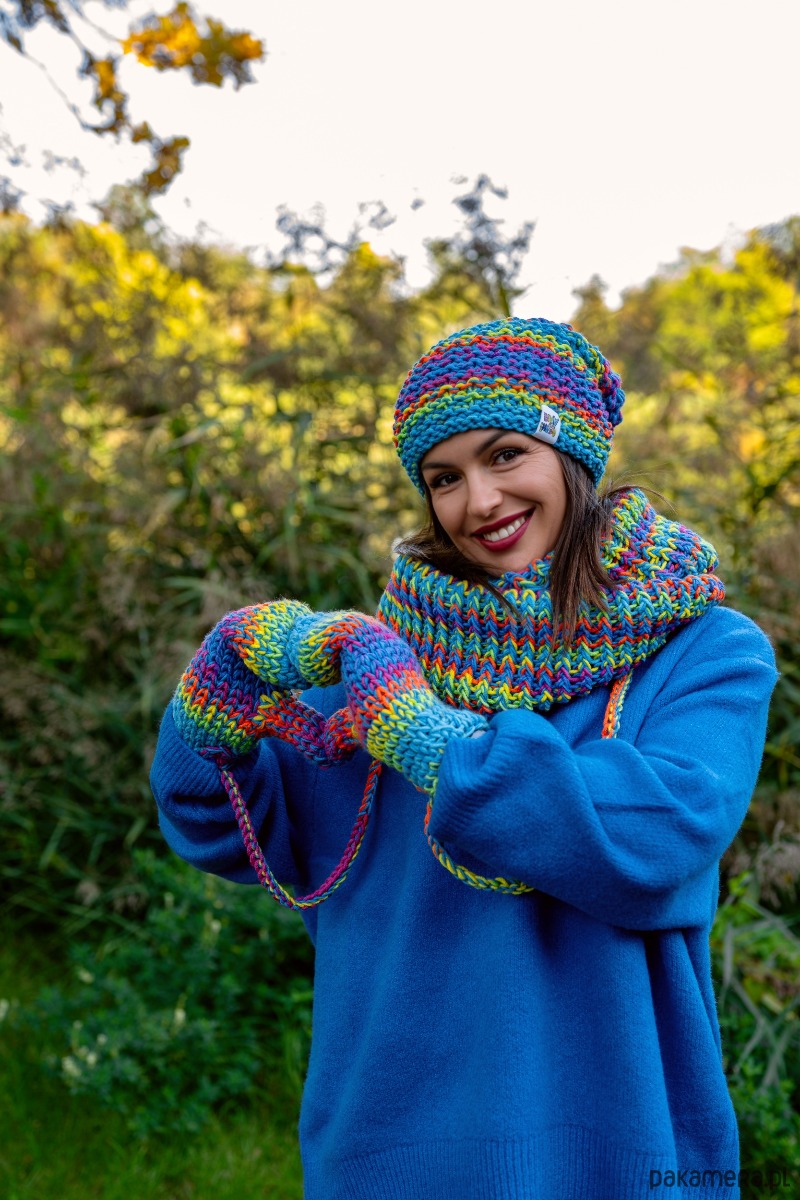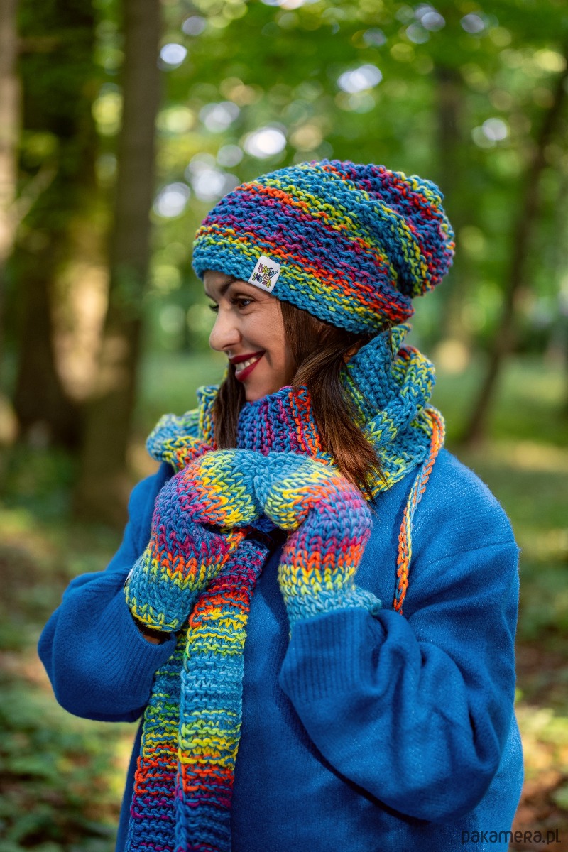 Czapka MERINO 50% ,,Tęcza błękit NEVERLAND