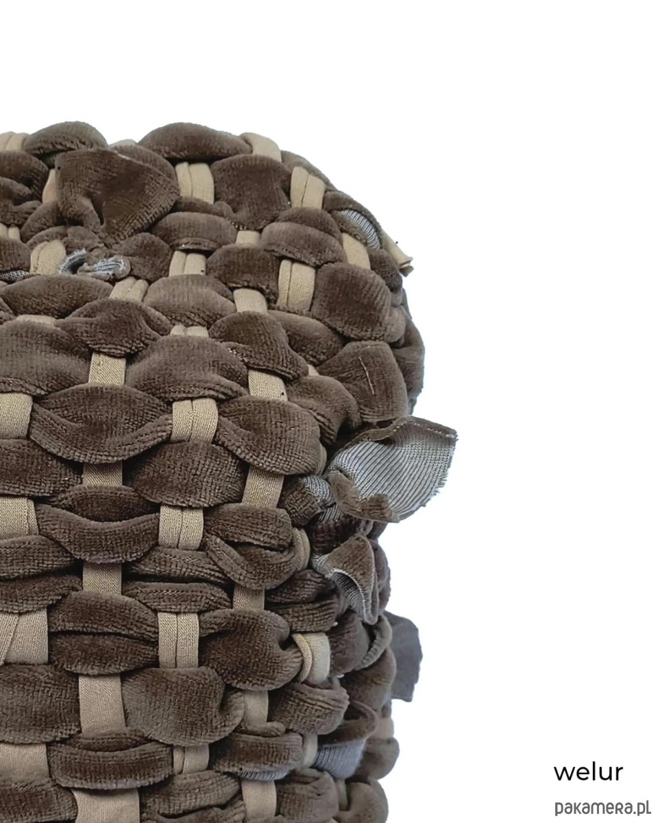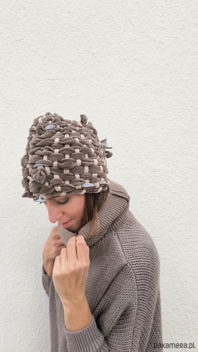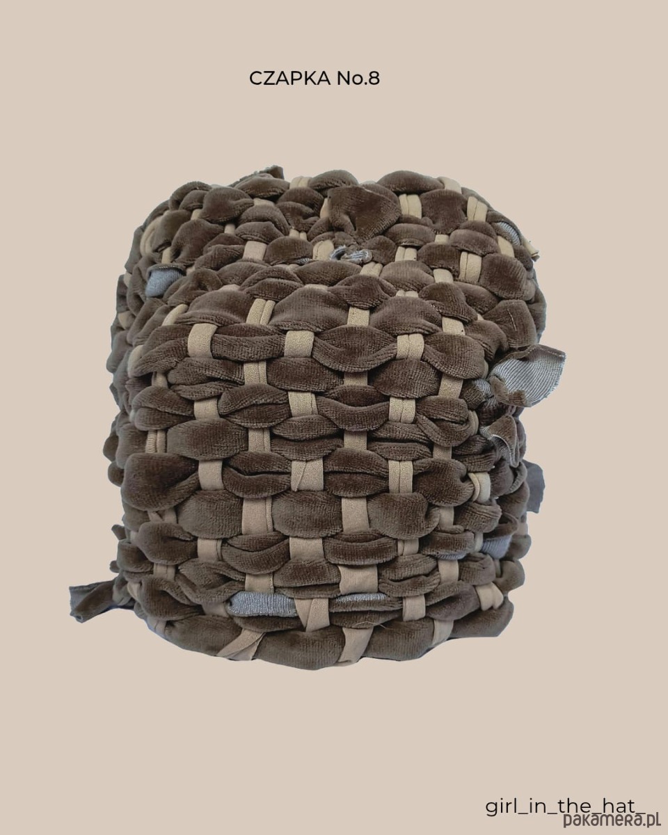 Piękna czapa, ręcznie wytkana na krośnie z pasów miękkiej i mięsistej tkaniny welurowej