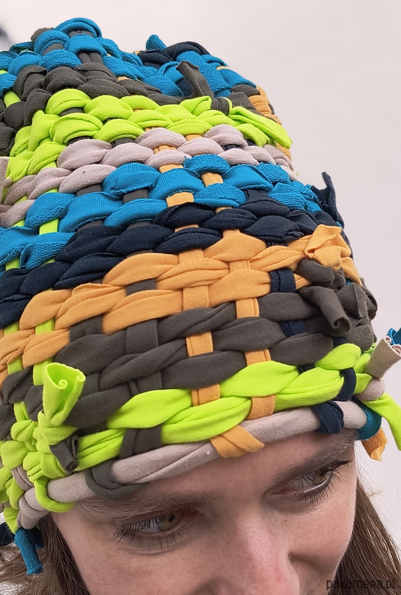 Wszystkie moje czapki tkam ręcznie na krośnie z pociętych pasów tkanin.