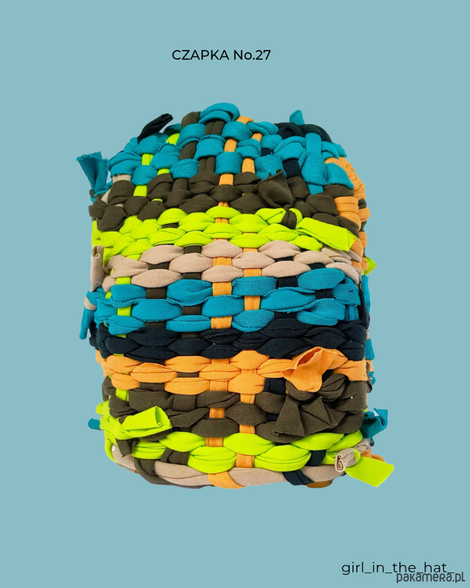 Piękna czapa, ręcznie wytkana na krośnie z pasów bawełnianych dzianin.