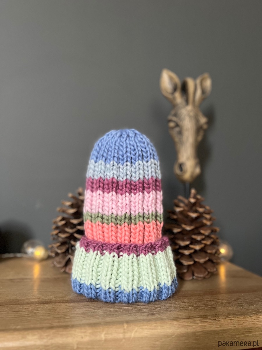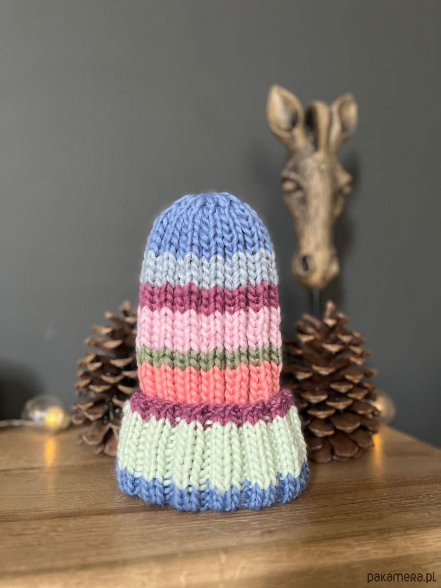 Czapka w paski, wykonana z naturalnej włóczki 100% wełna.