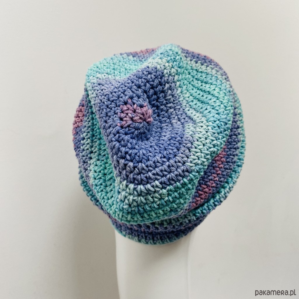 Czapka została wykonana ręcznie na szydełku z wysokiej jakości włóczki bawełniano-akrylowej, która nie gryzie i nie uczula.