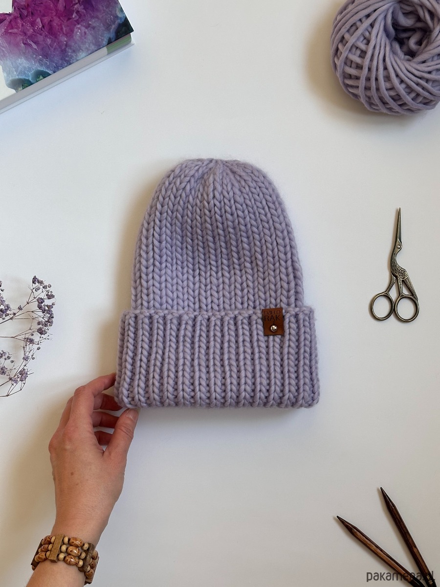 Zimowa, gruba czapka wełniana w delikatnym kolorze jasnej lili.
