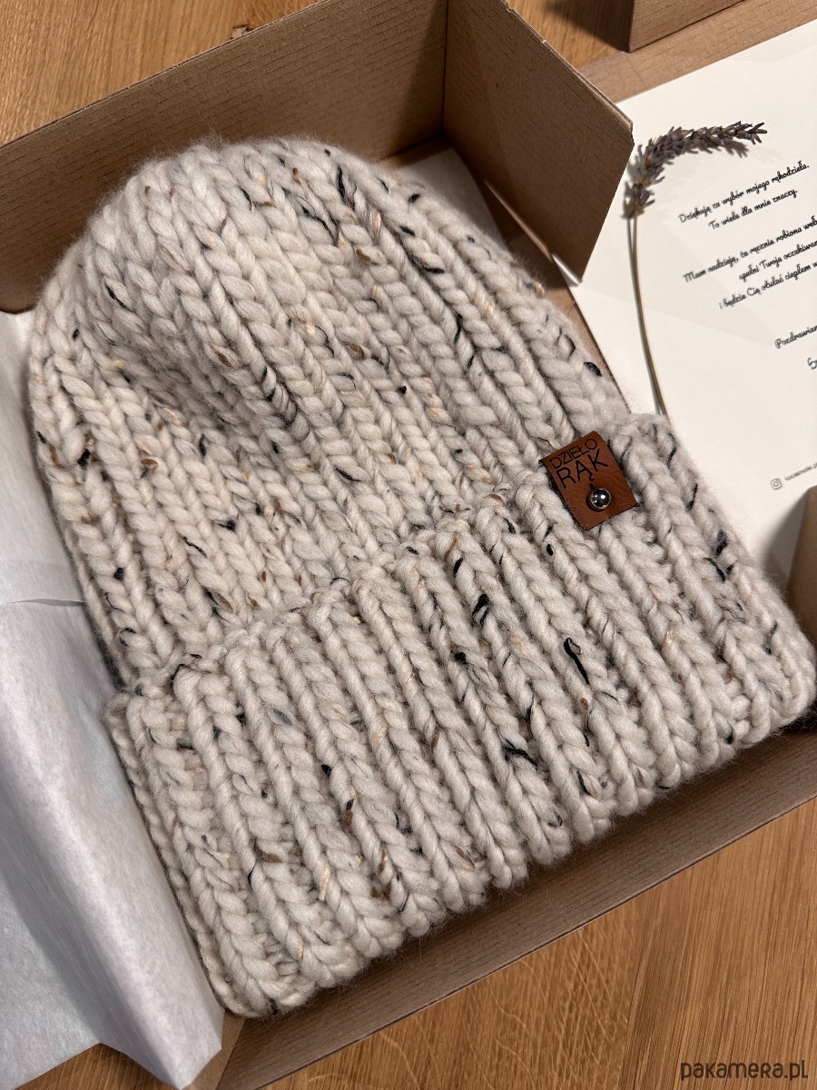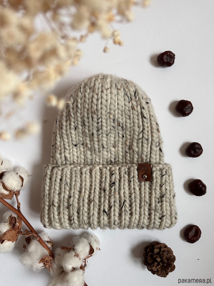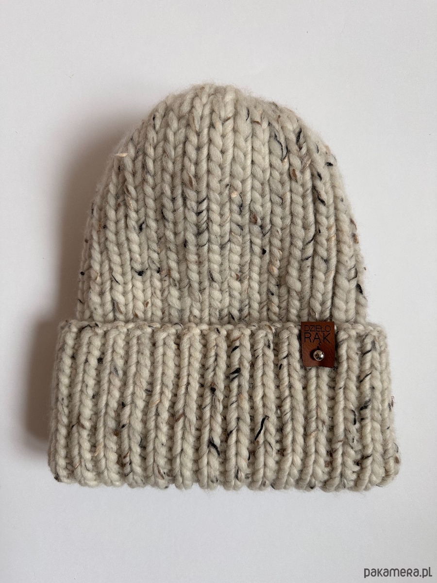 Zimowa, gruba czapka wełniana w ciekawym kolorze tweed naturalny.
