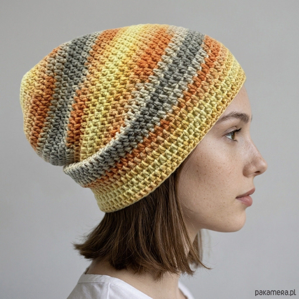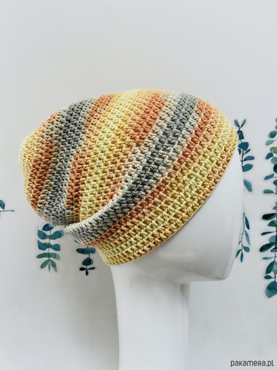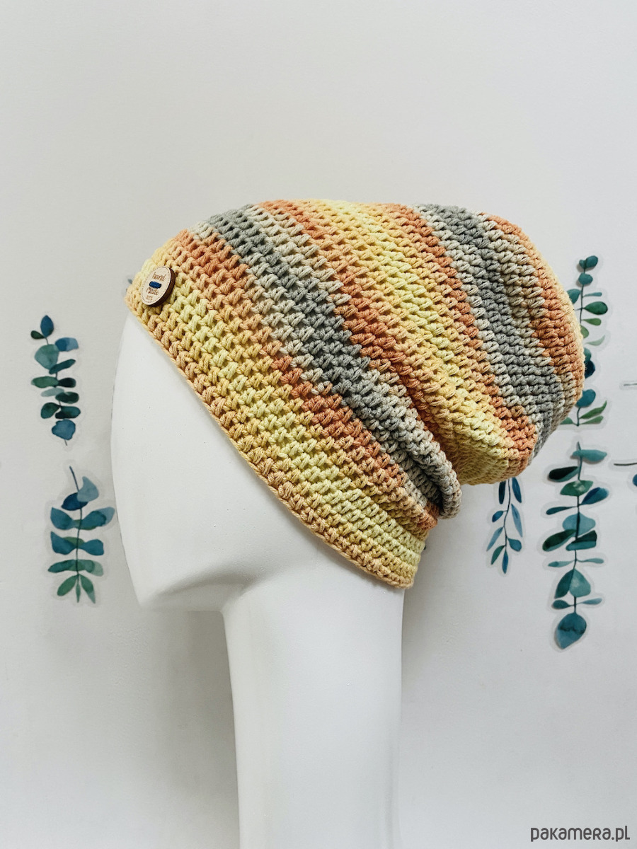 Czapkę wykonałam z wysokiej jakości włóczki bawełniano-akrylowej, która zapewnia wygodę noszenia przez cały dzień.