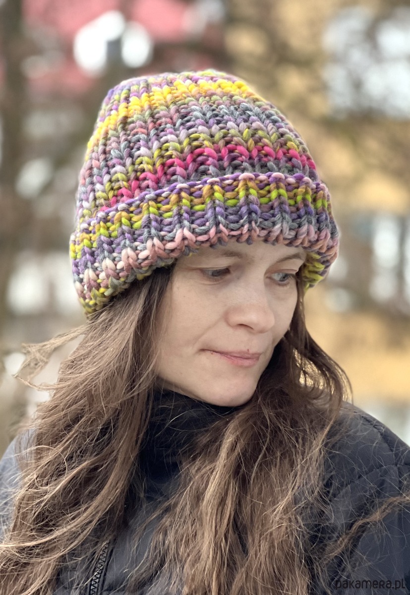 Gruba, ciepła zimowa czapka została wykonana z wełny merynosa 100% w żywej kolorystyce. Włóczka wysokiej jakości, certyfikowana, pochodzi z Włoch, posiada certyfikat mulessing free.