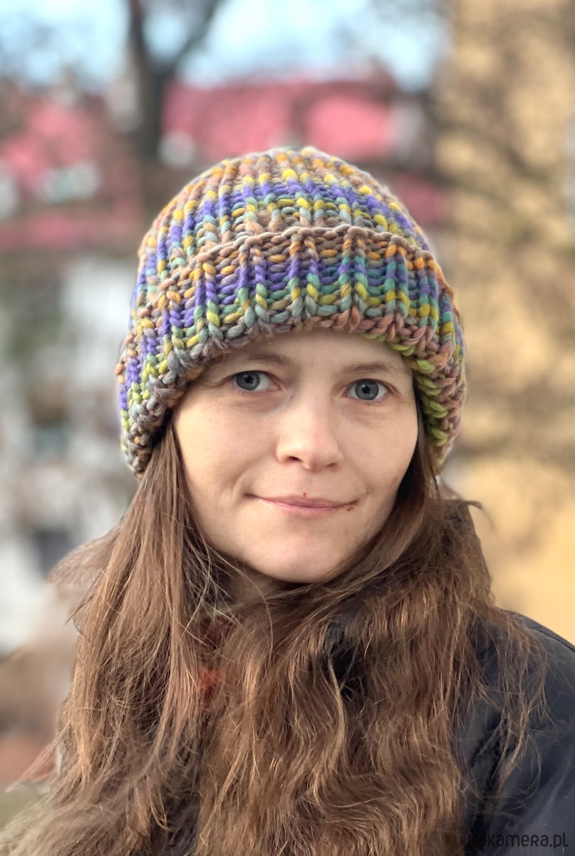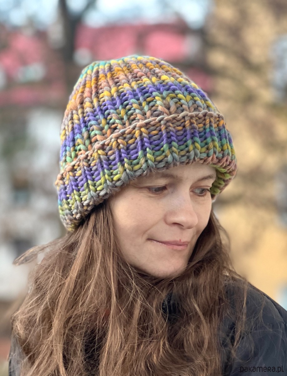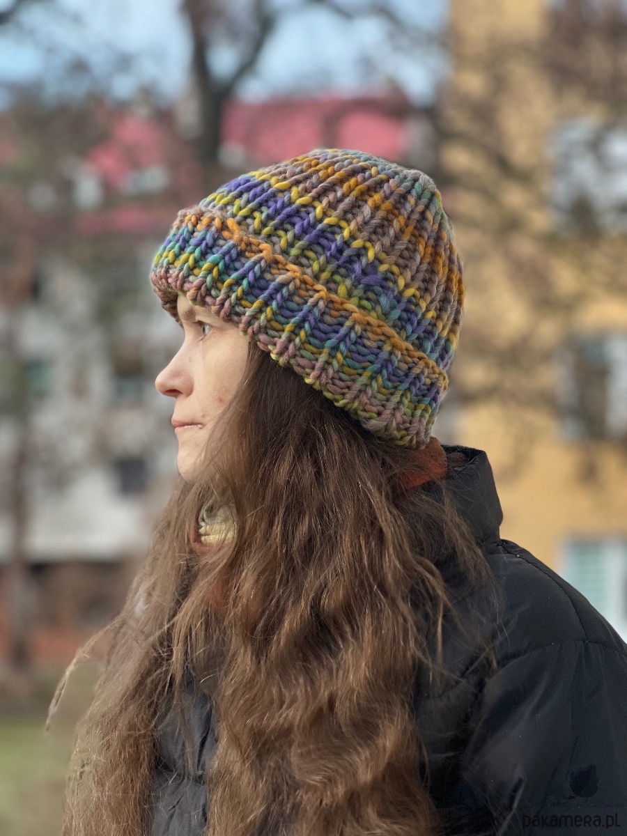 Gruba, ciepła zimowa czapka została wykonana z wełny merynosa 100% w żywej kolorystyce. Włóczka wysokiej jakości, certyfikowana, pochodzi z Włoch, posiada certyfikat mulessing free.