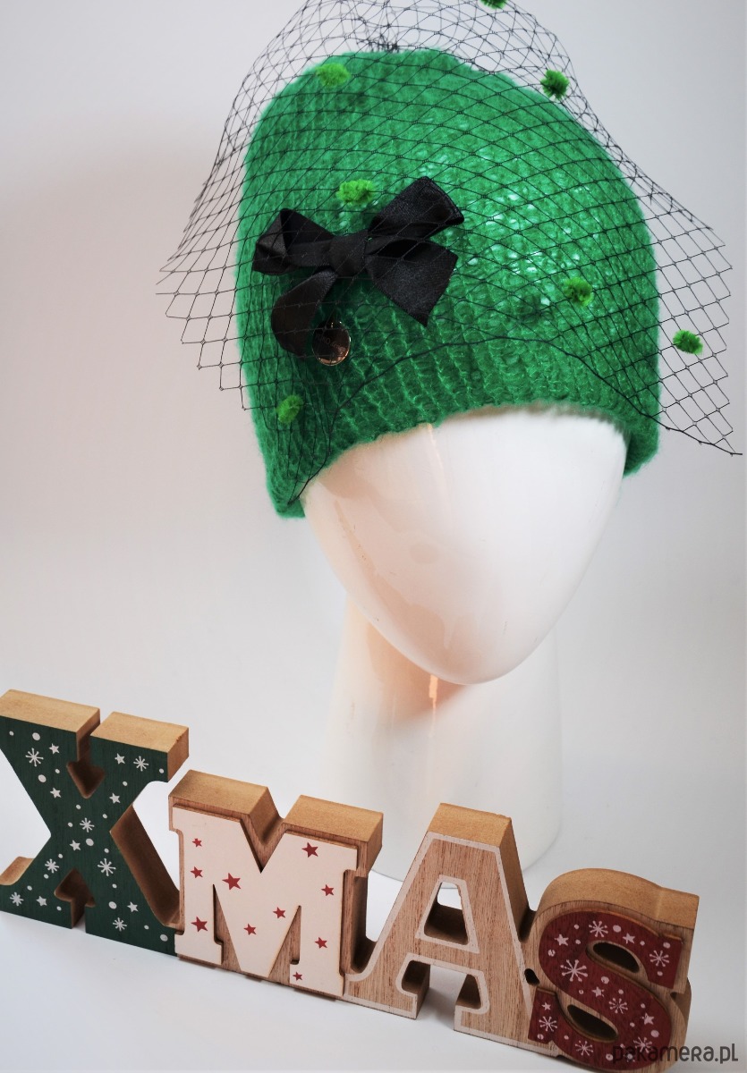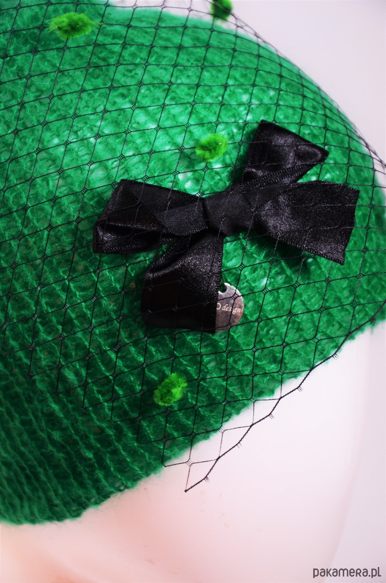 Czapka ultra delikatna wykonana z dwóch warstw z wełny moherowej w kolorze zielonym. Zdobiona uroczą kokardką i woalką z pomponami. Rozmiar uniwersalny.