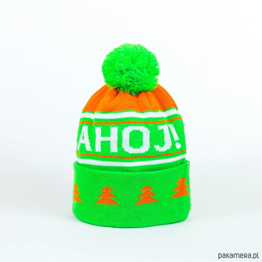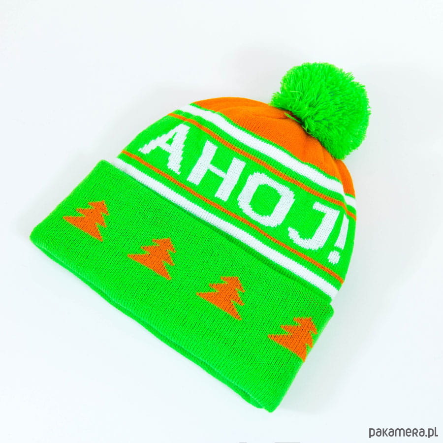 Zielona czapka zimowa na mroźne i szare dni z pomarańczowym pomponem dla osób lubiących wyróżniać się z tłumu. Czapka posiada duży napis AHOJ! oraz szeroki i wywijany brzeg z choinkami. Doskonale ochroni głowę przed szalejącym wiatrem i niskimi temperaturami. Sprawdzi się podczas wypadów w teren, jak i w trakcie codziennego użytkowania w mieście.